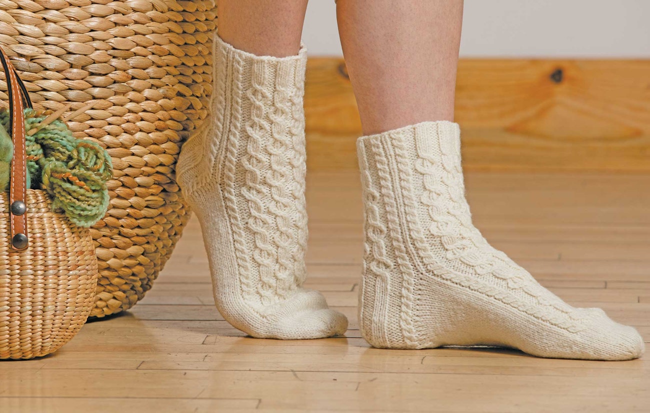 Tuck these cozy Double-Cable Socks into your spinning bag for guild meetings, gatherings, and workshops. Photo by George Boe