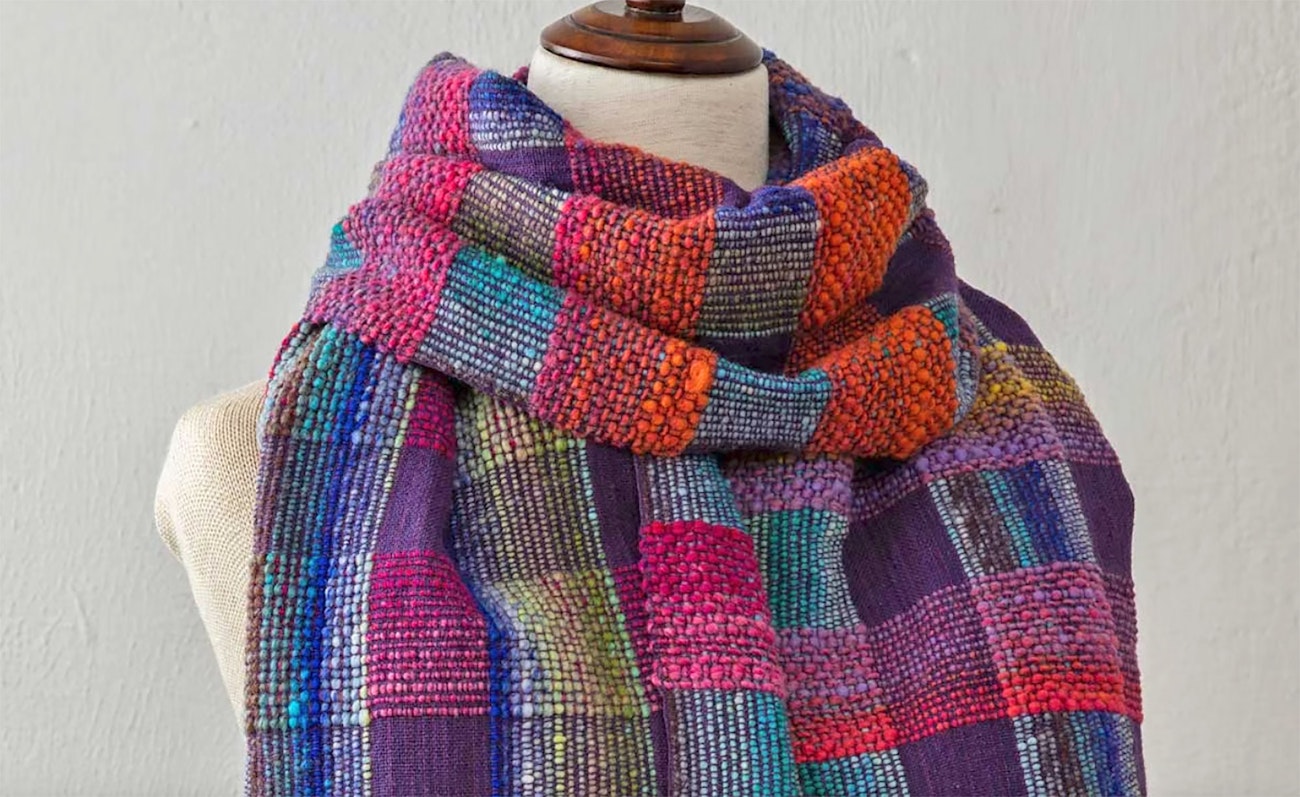 Véronique Perrot‘s Autumn Jewel Scarf uses knitting yarn in a design that combines blocks of diversified plain weave and plain weave. Photo by Matt Graves