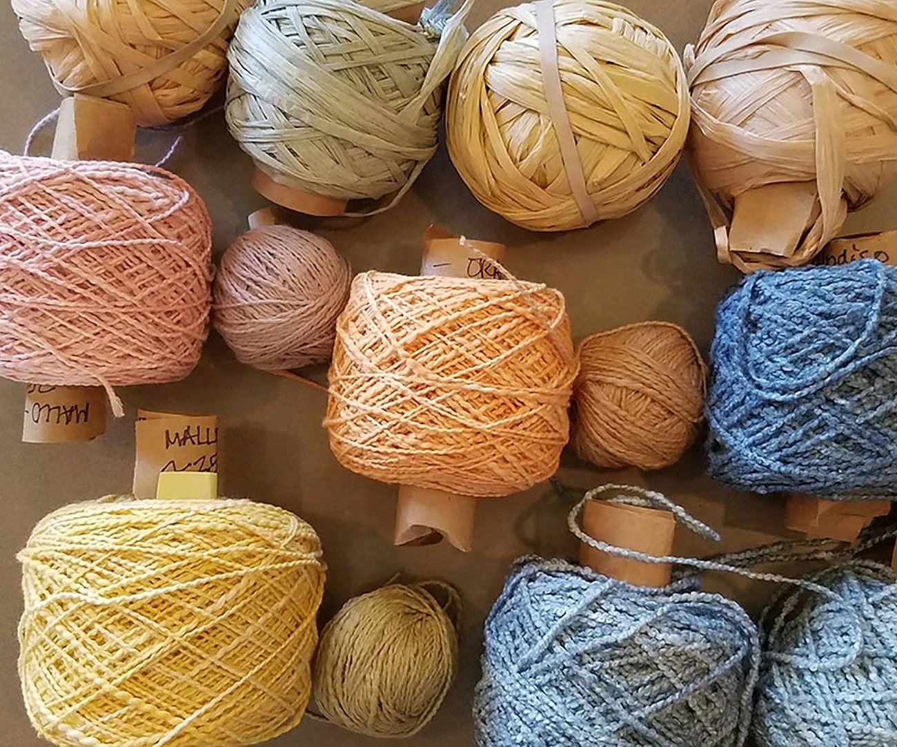 Balls of mud-dyed yarns including cottons and raffia. The colors are subtle in some cases, but beautiful. Photo by Susan E. Horton