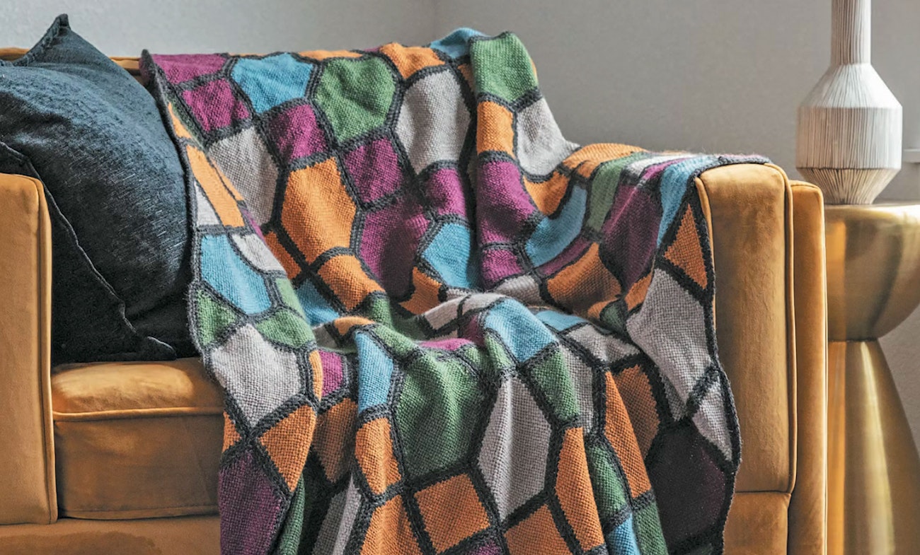 The Cathedral Window Blanket by Gabi van Tassell, found in the Fall 2022 issue of Little Looms, combines elongated hexagons and squares formed on the pin loom. Photo by Matt Graves