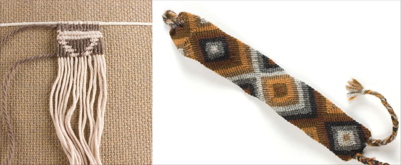 The Cavandoli friendship bracelet pattern lines move diagonally, but this technique is often worked horizontally. Photos by Ann Swanson