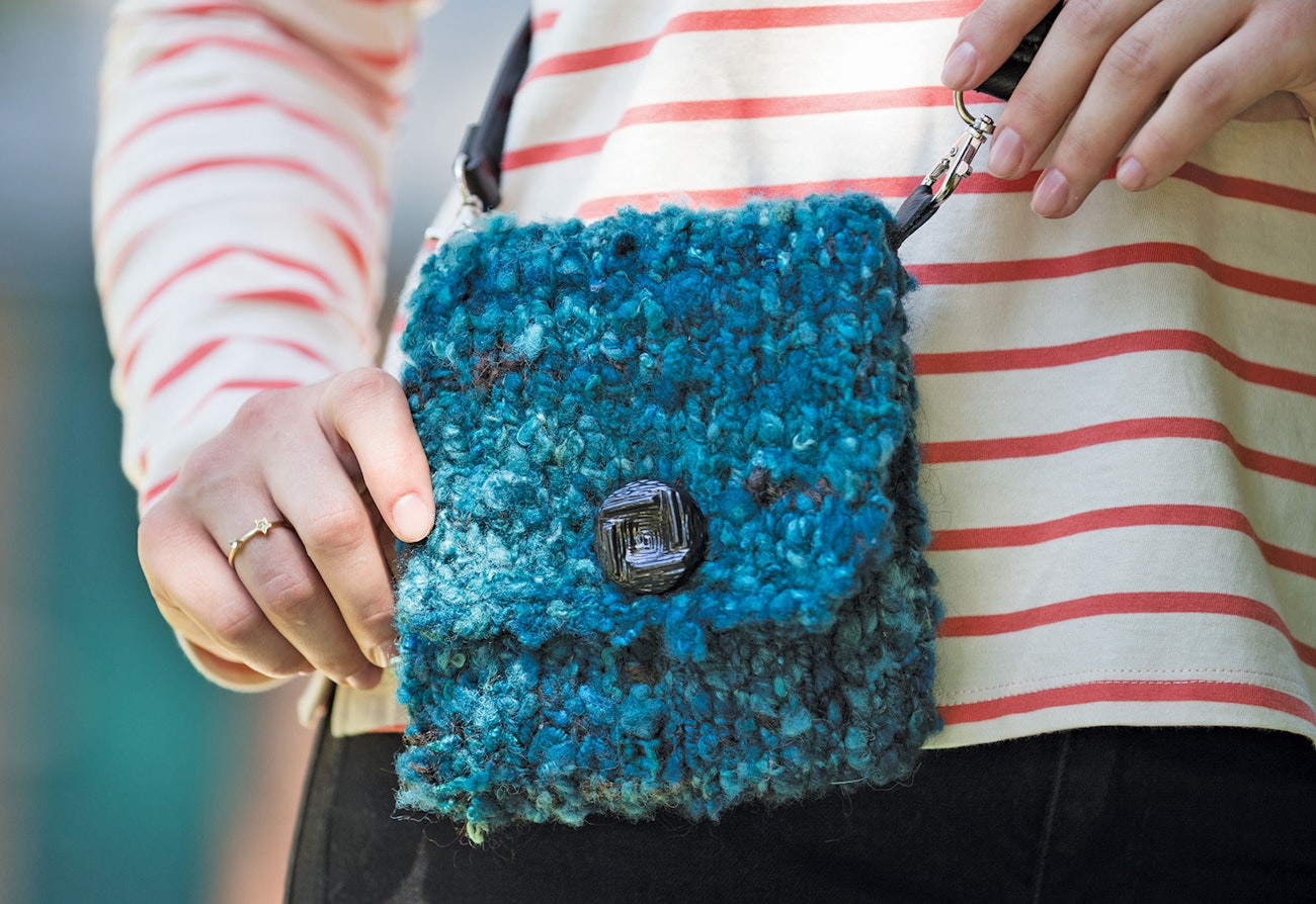 Just a little bit of art yarn can make a caressable accessory, like this adorable purse by Kathy Augustine. Photo by George Boe