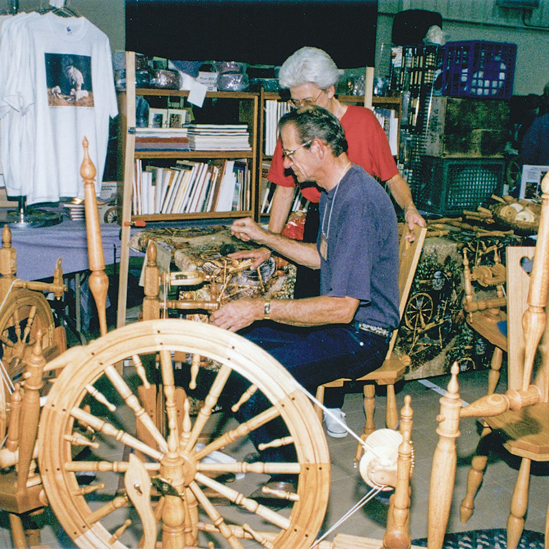 Every year, Marge and Rick traveled 50,000 to 60,000 miles in a customized van to major shows and smaller fiber events around the country. When Rick and Marge were at home in Iowa, production in the new workshop had to be continuous and speedy to keep up with demand, but the pace did not feel frantic to the prolific wheel maker. Rick described the workshop as “very casual. You can get more done in a relaxed atmosphere.” Marge agreed, saying, “It didn’t really seem as if we were working.”