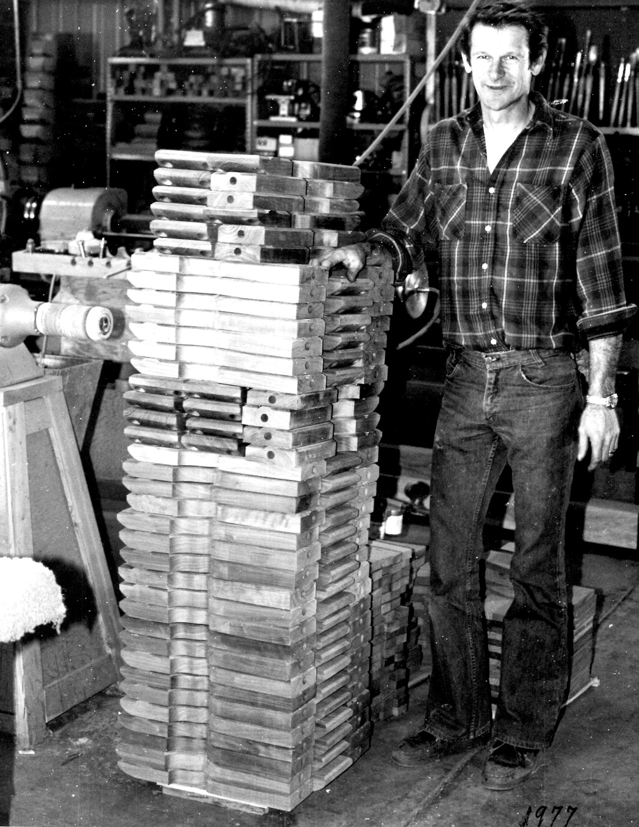 Rick and Marge rented an old house in West Amana in 1975. They set up shop in Norman Schanz’s workshop in the Amana Colonies, seven Iowa towns founded as a self-sufficient community that became an economic and tourist destination. The Reeveses were the first “outsiders” to be invited to work in the Amana Colonies. At the time, Rick made novelty items. Twenty-five tour buses a day would empty out in front of the shop, and Rick had to turn enough lamps, candle stands, bells, and cribbage boards to meet demand. At that time, he was producing a wheel or so per month in his spare time.