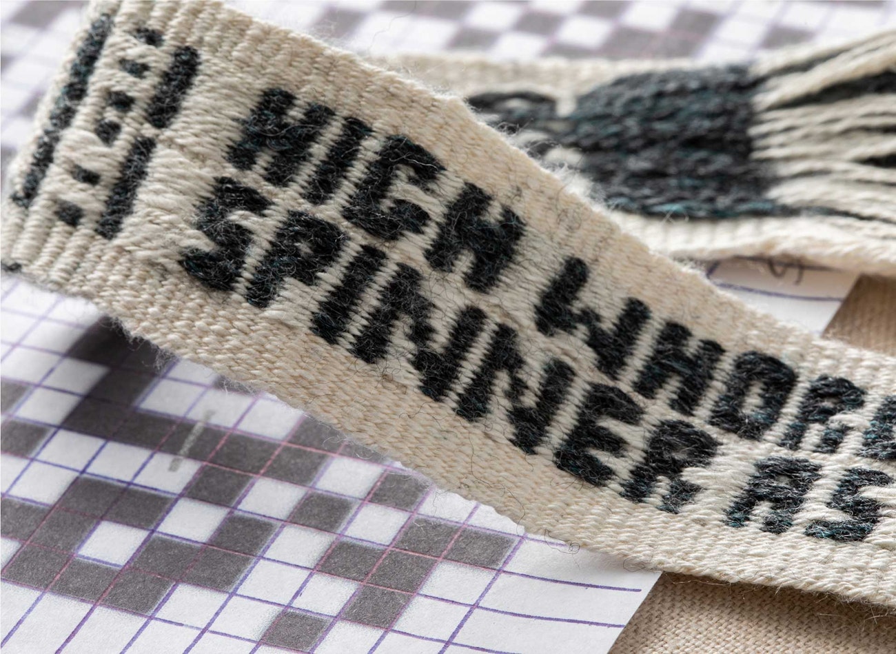 The QR-code band inspired my next challenge: a warp with three lines of text. No warp threads would have to change during the weaving, but the pattern draft would need careful attention so that all three lines would start and stop at the same place. The saying could be longer but not so long that it couldn’t be read easily and not so wide that my loom and hands could not hold and manipulate individual threads. After the planning and setup, I found it was great fun to weave.
