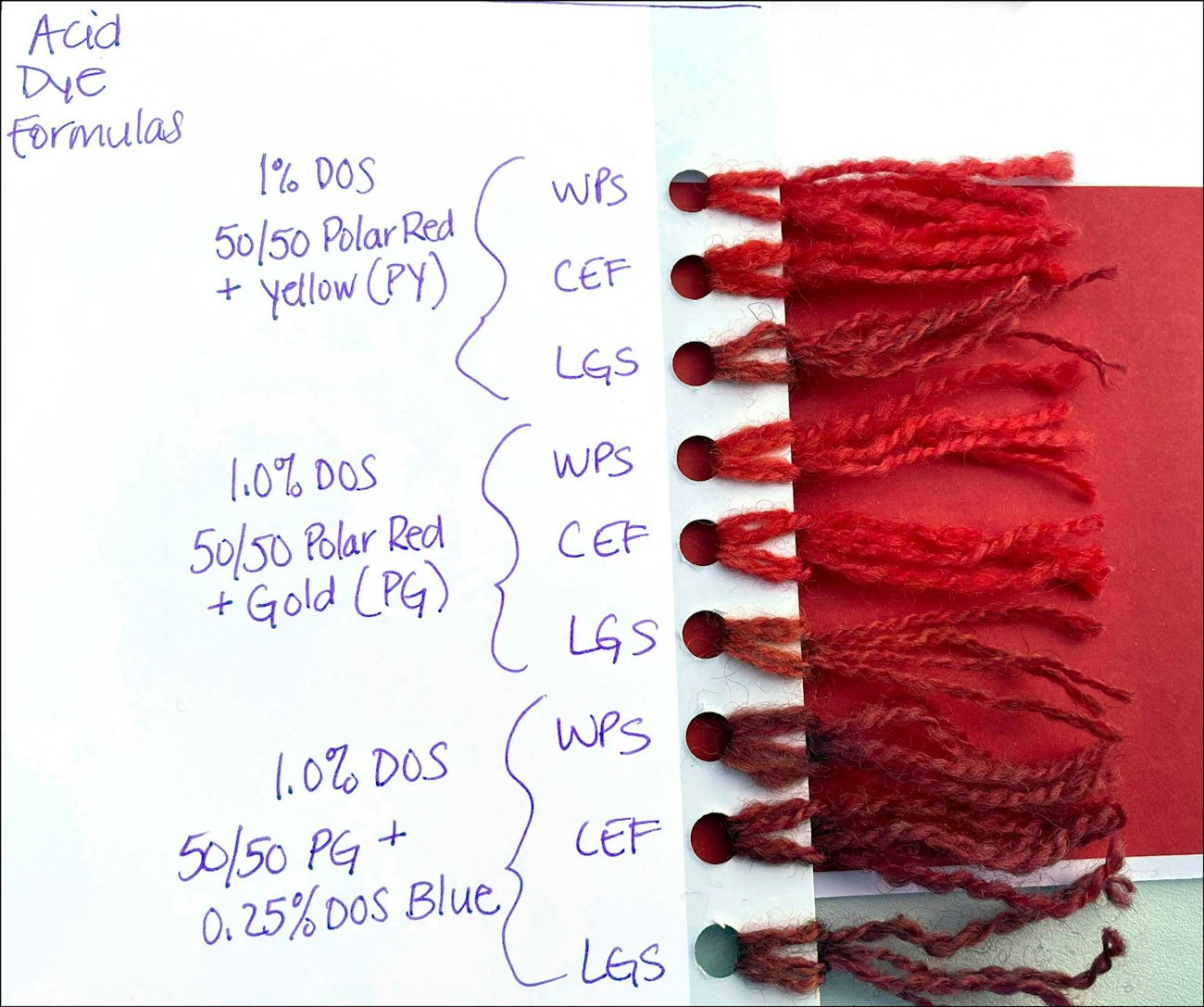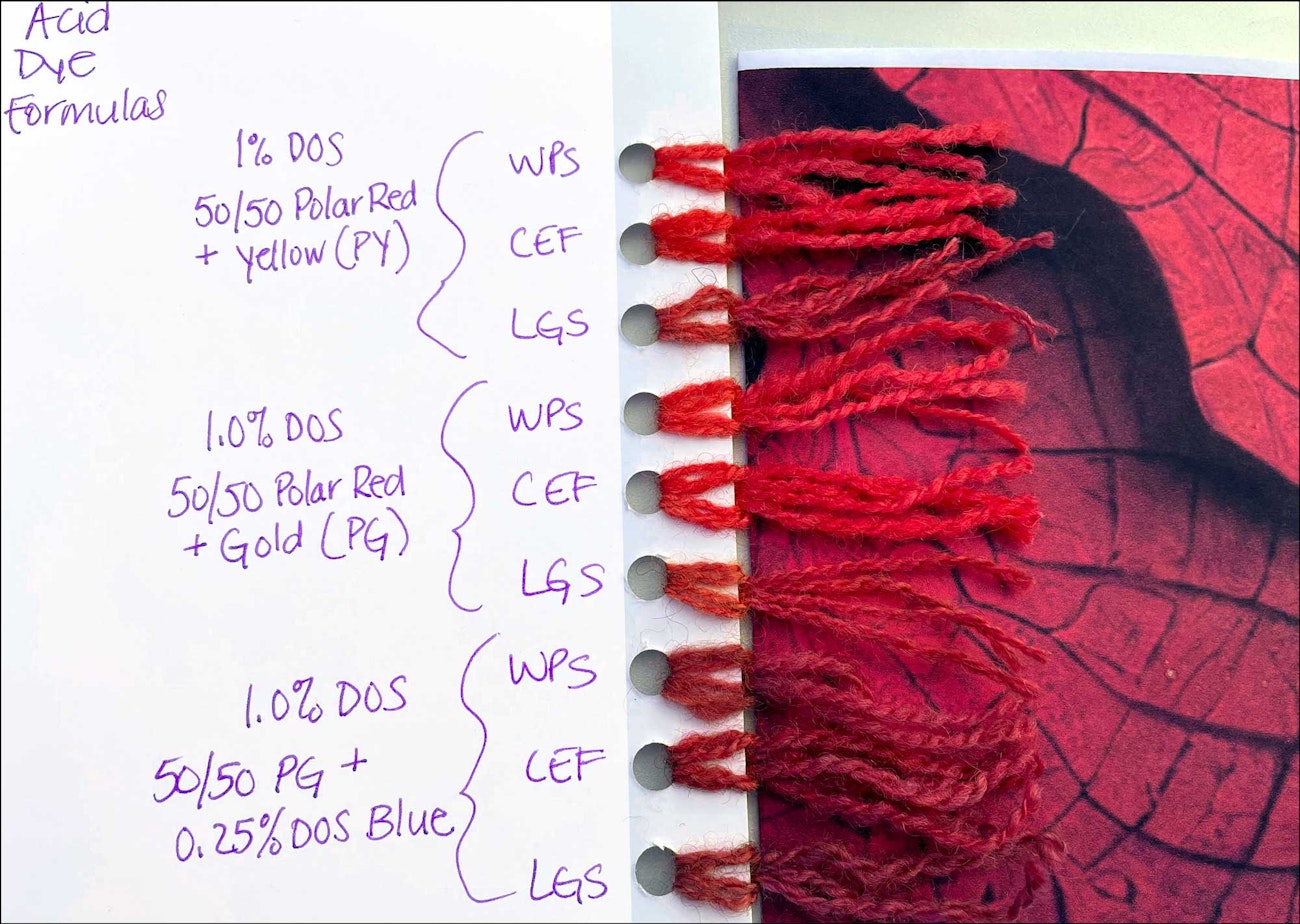 For the natural dye version, I chose cochineal at roughly the same depth of shade. I added 6% weight of fiber (WOF) of cream of tartar (CoT) to push the hue toward a more yellow direction. [PAYWALL]I knew to do this from experience with my well water. Your water source and its mineral content can affect natural dye results. The samples were mordanted with a 15% alum solution before dyeing.