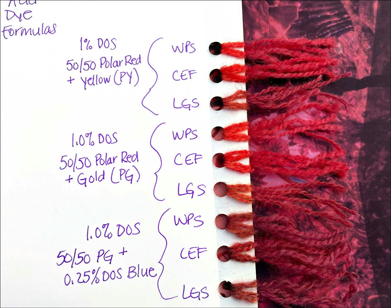 To begin this process of color exploration, I first needed to choose a place to start with color mixes, and this was based on my own observations and color-recipe notebooks. I also needed to choose several fiber bases to dye, since the color of the yarn or fiber will affect the final hue. I selected three different yarns: a white Polwarth silk (WPS), a cream-colored East Friesian (CEF), and a light-gray Shetland (LGS).