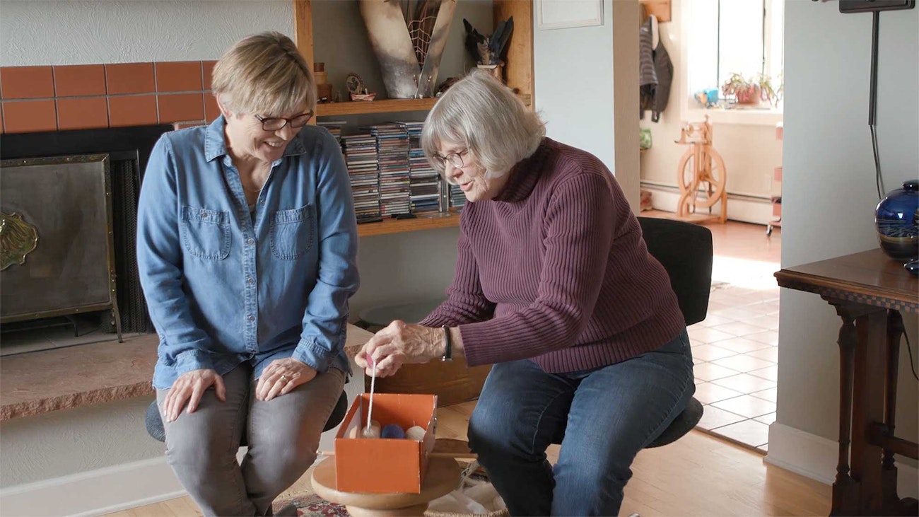 Maggie Casey pokes a couple of holes in a shoebox to hold her spindle or a knitting needle with a bobbin on it. Photo from The Spinning Teacher with Maggie Casey by Long Thread Media