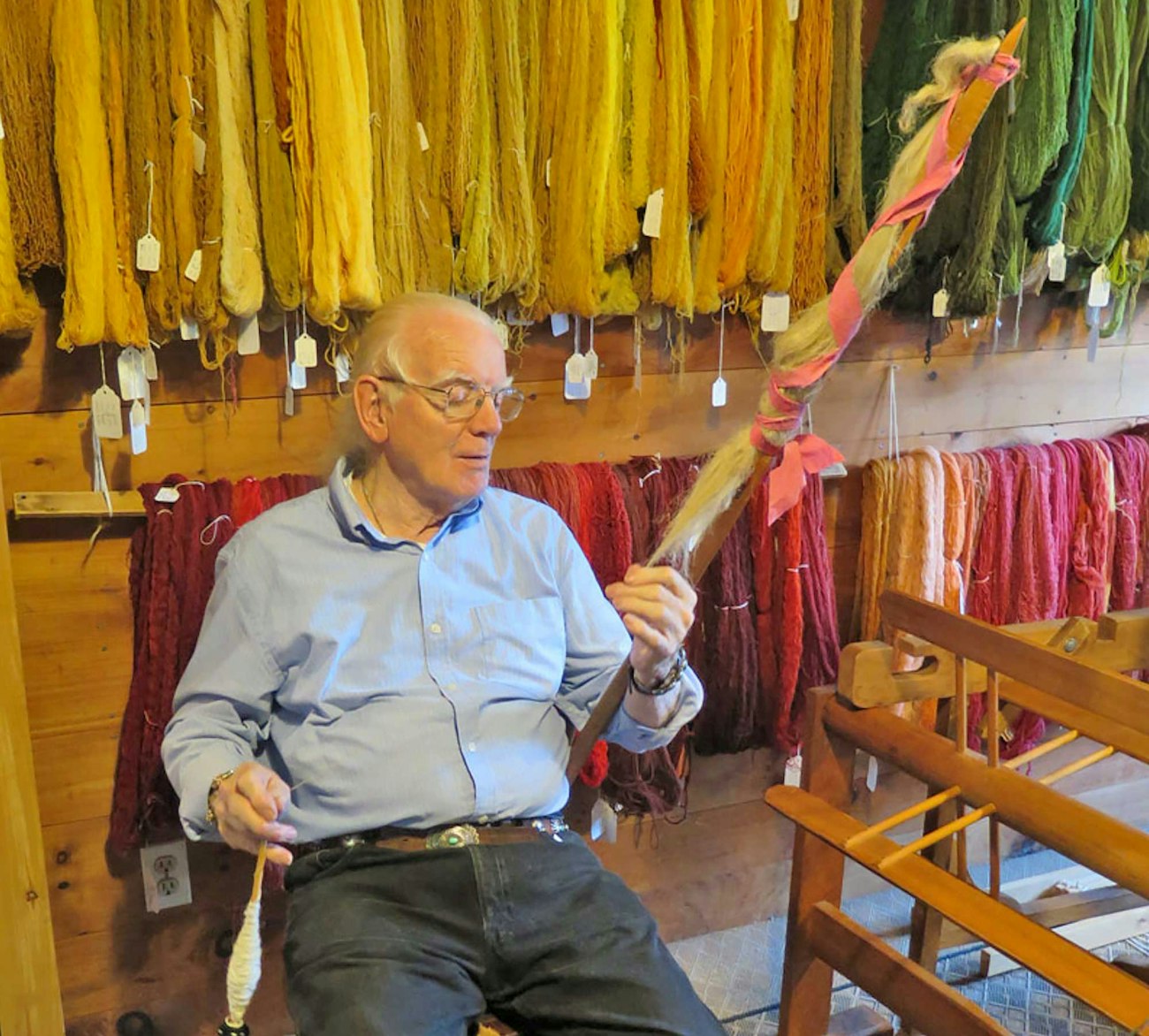 Norman Kennedy spins flax with a distaff tucked in his belt and a spindle held in his hand. Photo by Bruce Engebretson