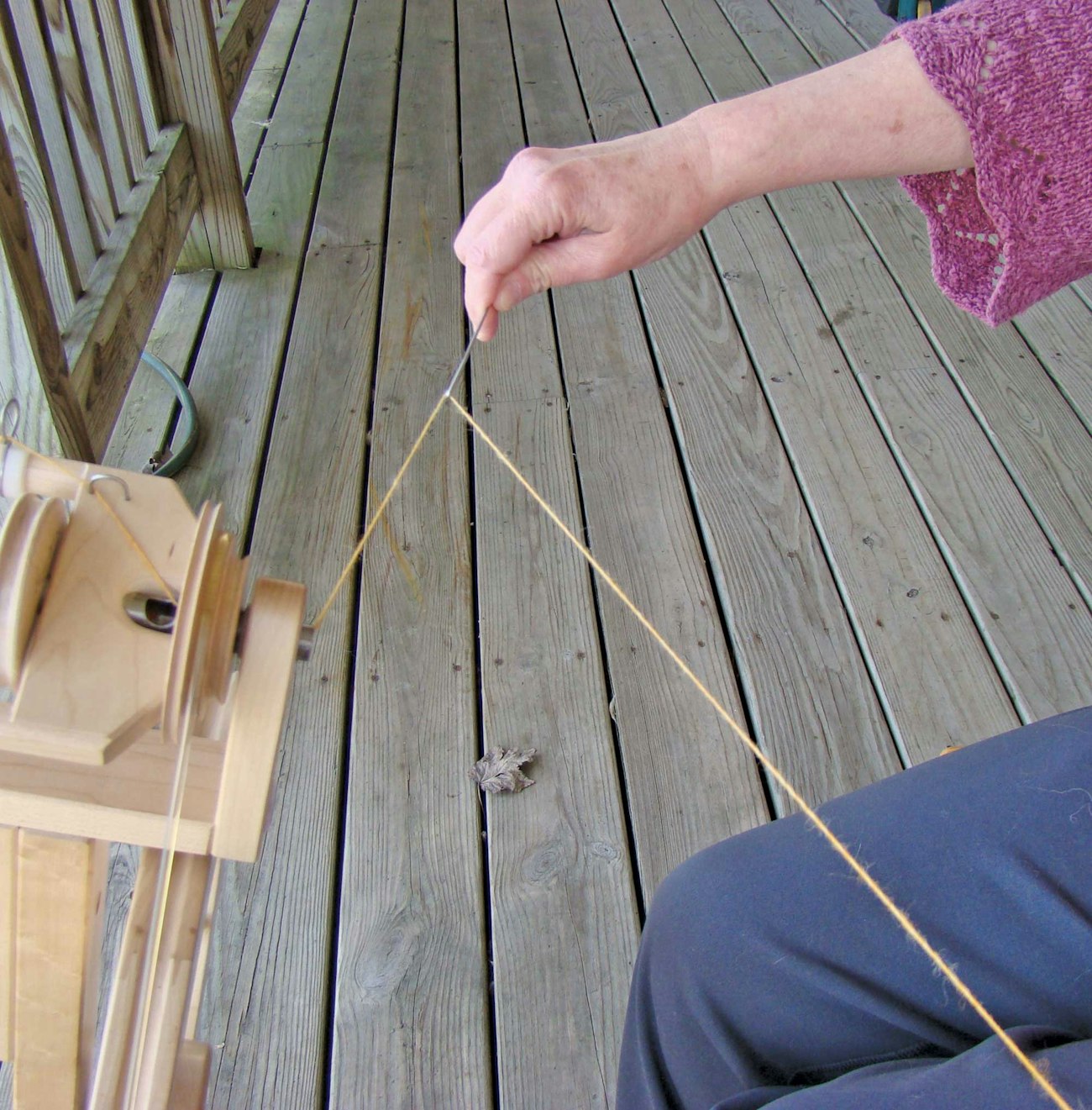 The strategy I use for spinning singles at a consistent thickness is to use a reference sample, commonly known as a plyback sample. A reference sample is a length of plied yarn that you use as your “ideal” to which you compare your spinning. I suggest making a fairly long reference sample, about 24 to 36 inches. That way, if there are some inconsistencies in thickness, you are likely to capture them within this longer sample.