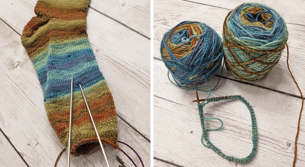 Debbie works to complete the toe of the socks that will ultimately become her mother’s (left) and uses the leftover yarn to cast on a pair of shortie socks for herself (right).