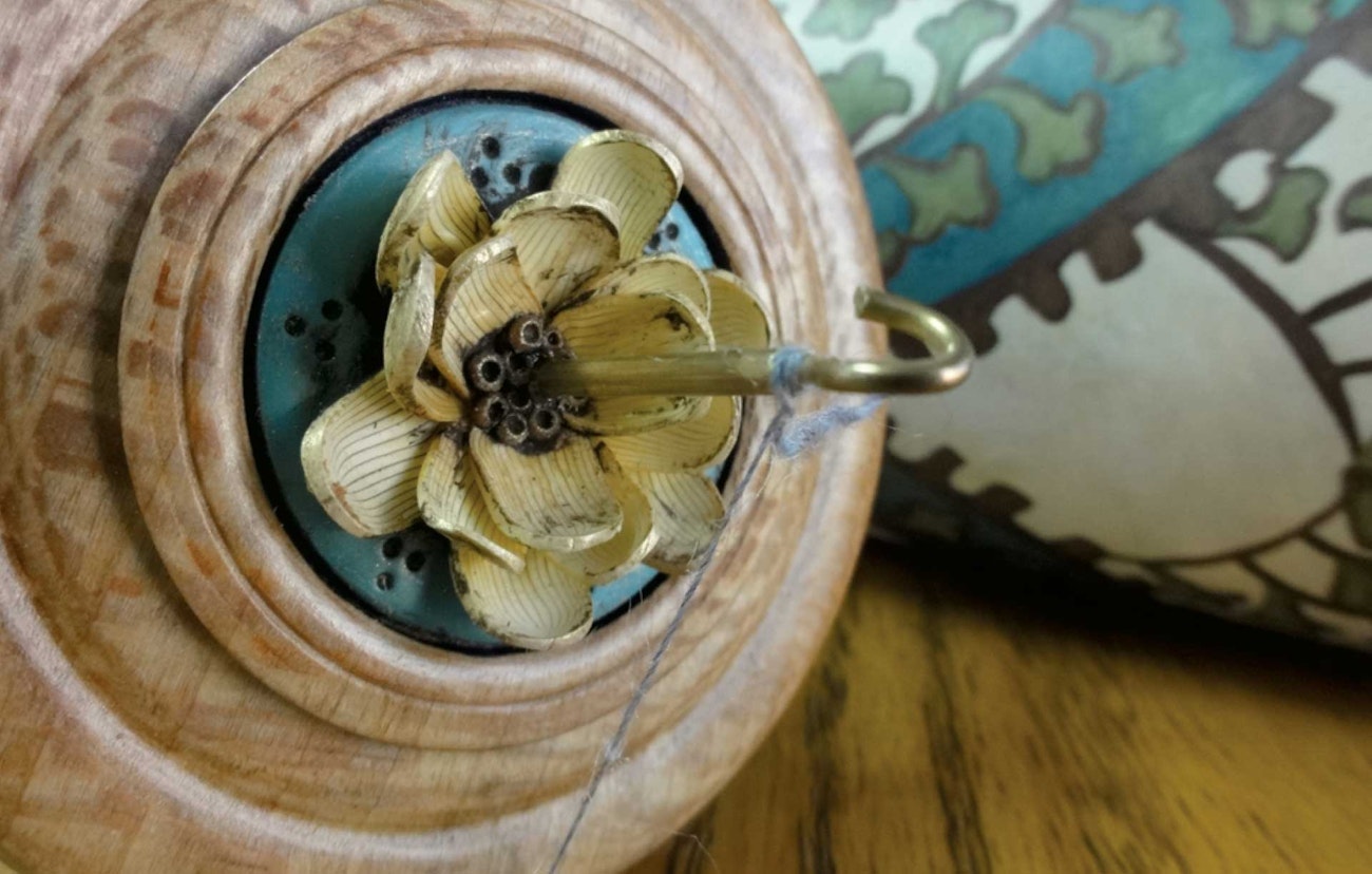 Ken often partners with other artists in the creation of his spindles, whether it be through painting whorls or creating polymer clay flowers for his experiments in three-dimensional finials as spindle toppers. He also takes on custom work, such as incorporating an heirloom button into a spindle at a customer’s request. Whatever the design or the project, Ken is firmly committed to the quality and craftsmanship of his products. If a customer has a problem with an item from KCL Woods, Ken will repair it free of charge as long as the customer pays the cost of shipping. “I will fix anything that I make, forever,” he says, adding that this also helps him improve on his designs for the future. “If anyone has a problem, I want to hear about it.”