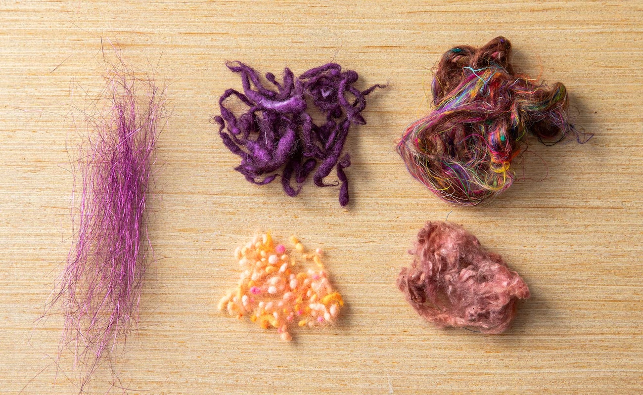 Blend ingredients: (left) Angelina, (top row) wool slubs and sari silk threads, (bottom row) wool nepps and silk noil