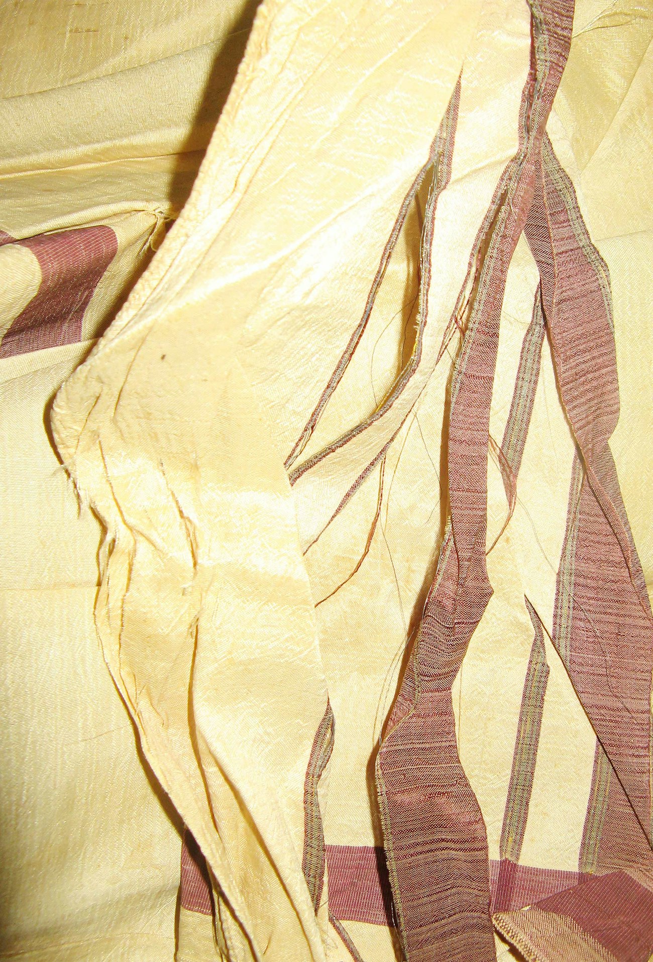 Dhotis are usually available in two lengths: double dhoti and single dhoti. The double dhoti is usually 3.65 meters long (about 4 yards), while a single dhoti is approximately 2 meters long (about 2.2 yards) Given the fragile condition of this dhoti, it took a lot of my skills to measure it. My research finds that today, silk dhotis are only woven as double dhotis. The single one becomes very transparent. The silk yarn that is available now is very fine compared to what was used over one hundred years ago!