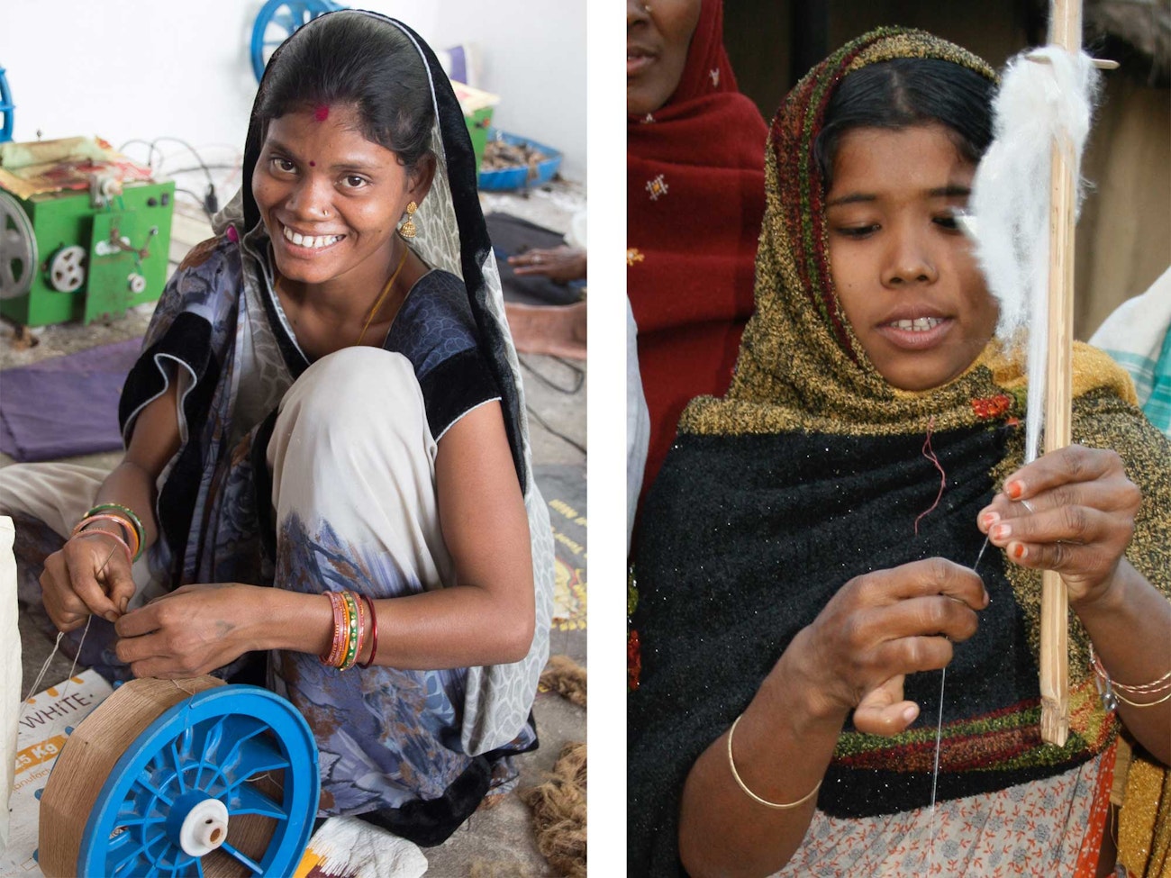 Left: Woman working on a modern reeling machine. Right: A young woman holds a distaff while spinning silk on a takli. (Takli not pictured.) Photos by Karen Selk from her book In Search of Wild Silk: Exploring a Village Industry in the Jungles of India