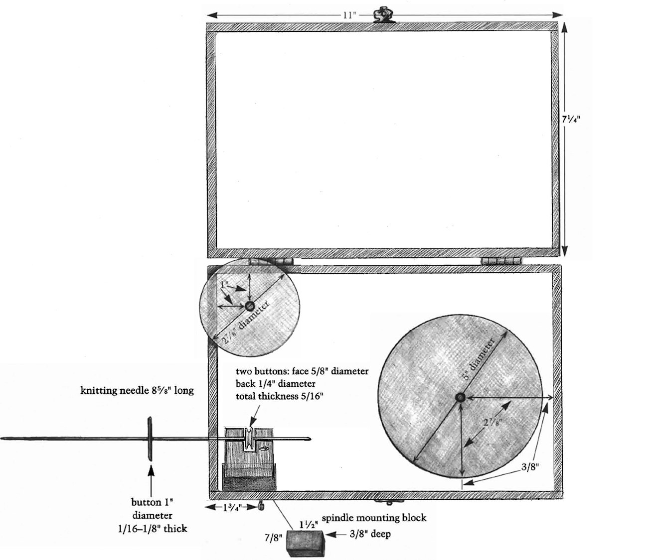 Marilyn’s one-box charkha plan, with measurements. Precise dimensions depend upon specific boxes. Drawing courtesy of the author