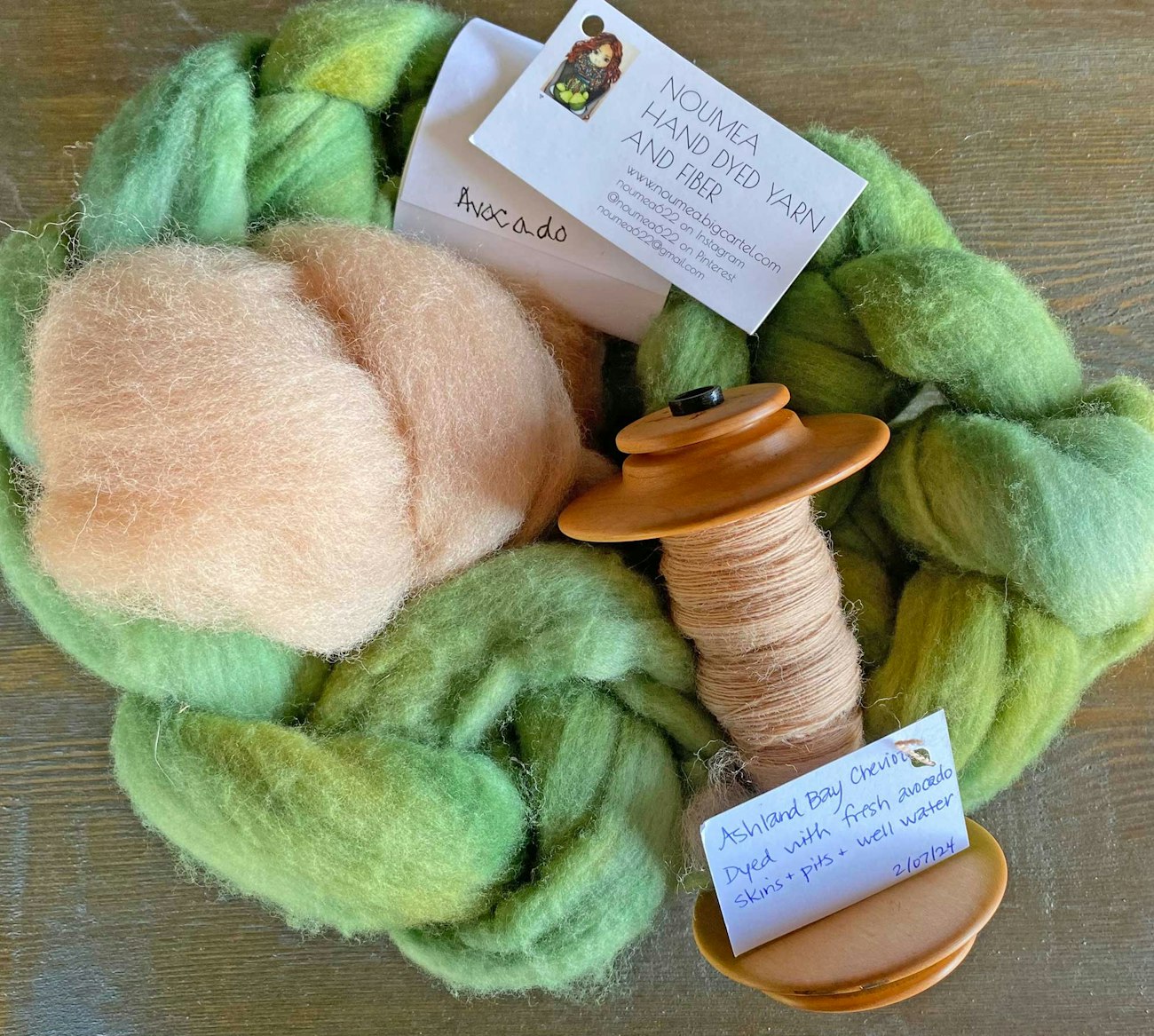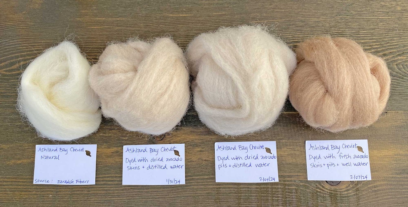 I happened to have bought some avocados last weekend and remembered that I saved a bunch of skins and pits last year to use as dyestuff. One of the articles I read on using avocado skins and pits as a dye source was in the Spring 2020 issue of Spin Off, “Avocado Ikat: A Spinner Explores Resist Dyeing & Botanical Color” by Rachel Simmons. I have started experimenting using different ratios of dyestuff to water, pits alone, pits and skins, and skins alone, as well as different water sources.