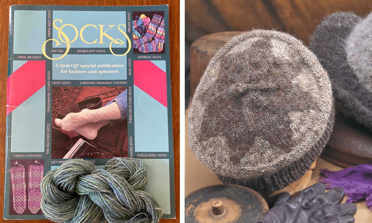 Two very different projects: Stefanie is considering making the Turkish Stockings, shown in the bottom left corner of her copy of Socks: A Spin-Off Special Publication for Knitters and Spinners (left) or the Zigzag Hat (right).
