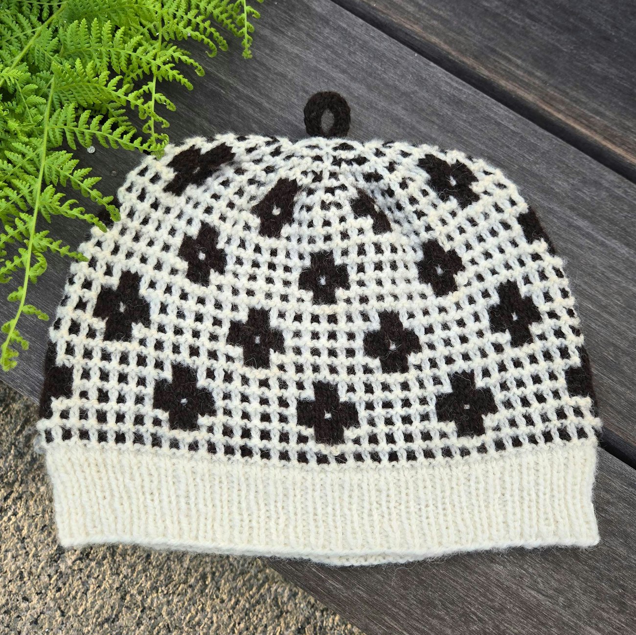 For the colorwork-themed spin-along, I decided to spin some Black Welsh Mountain and Whitefaced Woodland top to achieve high contrast. I knew I wanted to make the Pressed Flowers Hat, a popular mosaic knitting pattern by Amy Christoffers. The fiber was spun on my favorite cross-arm spindle at 22 wraps per inch (wpi) and plied to a sport weight at 12 wpi.