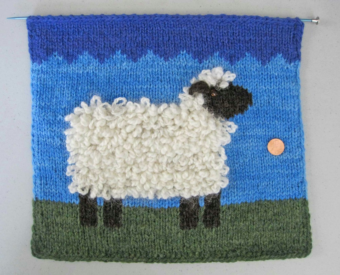 After spinning, I dyed some of the white yarn for the sky blue and purple in the design. I tend to spin by the seat of my pants, despite having access to plenty of technical info about weighing, measuring, etc. for consistency. So the big challenge was to spin the various wools to a similar size so they would work together for the Intarsia knitting technique in this pattern, which is modified from Block 27 of the Knitterati Afghan, by Cascade Yarns. I used the loop stitch for the sheep’s fleece, and the ear and edging are crocheted. A vintage 14" knitting needle serves as a rod for use as a wall hanging.