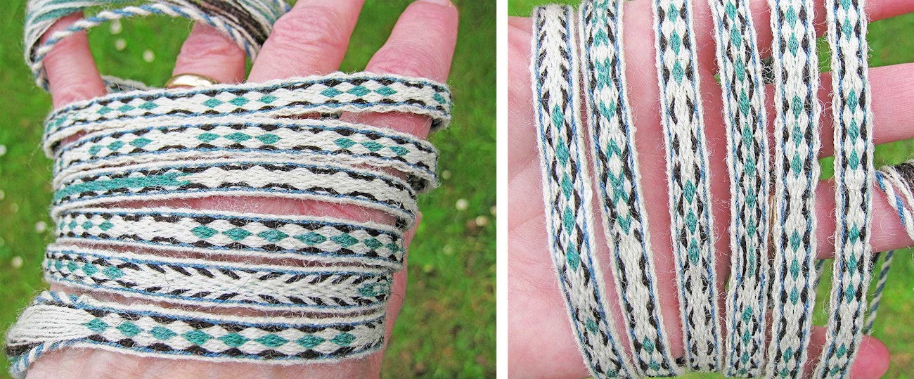 I improvised the patterns on this little tablet-woven sampler as I went along. The yarns are fine laceweight, spindle spun from Jacob and blends of mystery wool/Merino/silk prepared on minicombs. Thanks again for the challenge; I had a wonderful time.