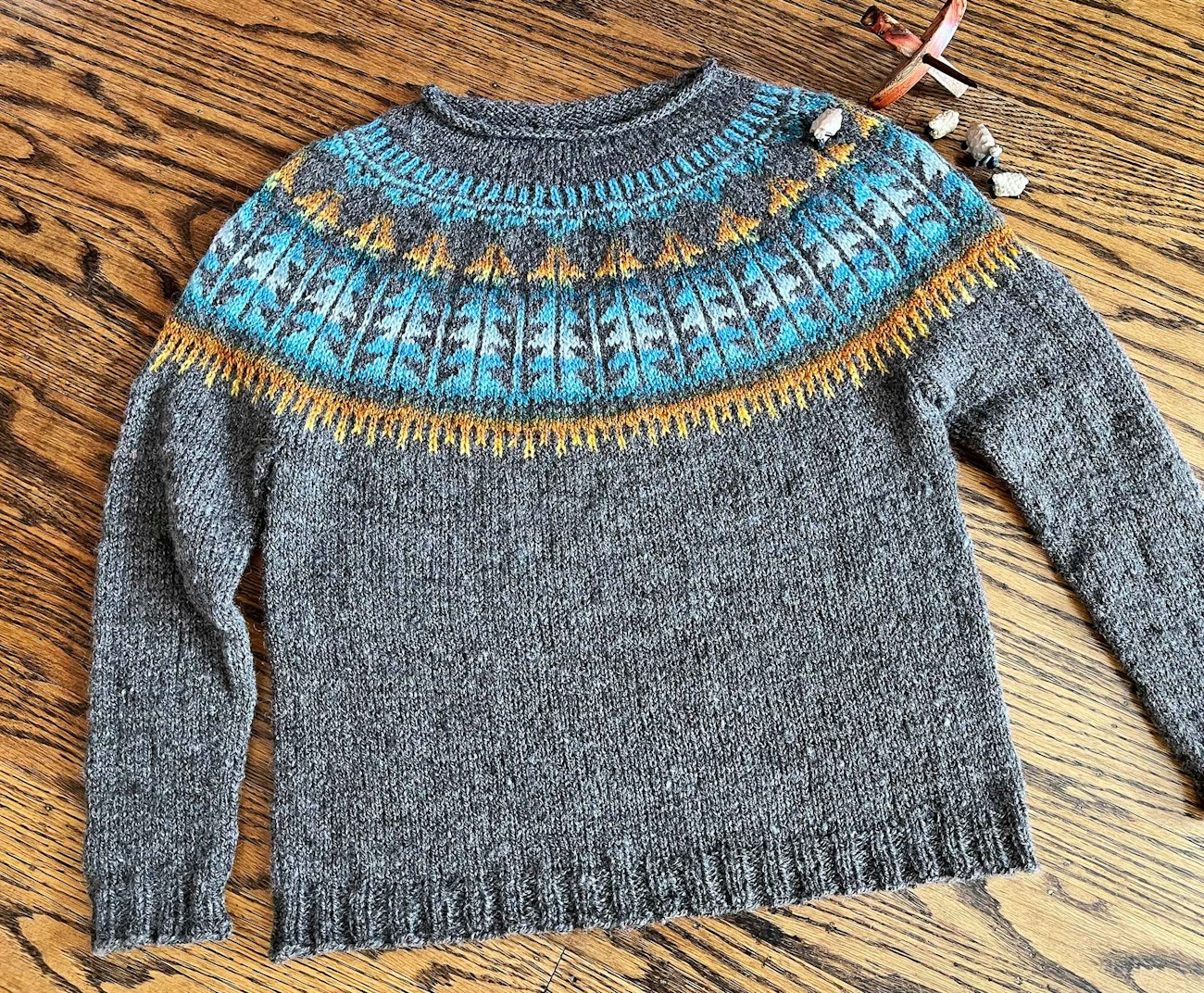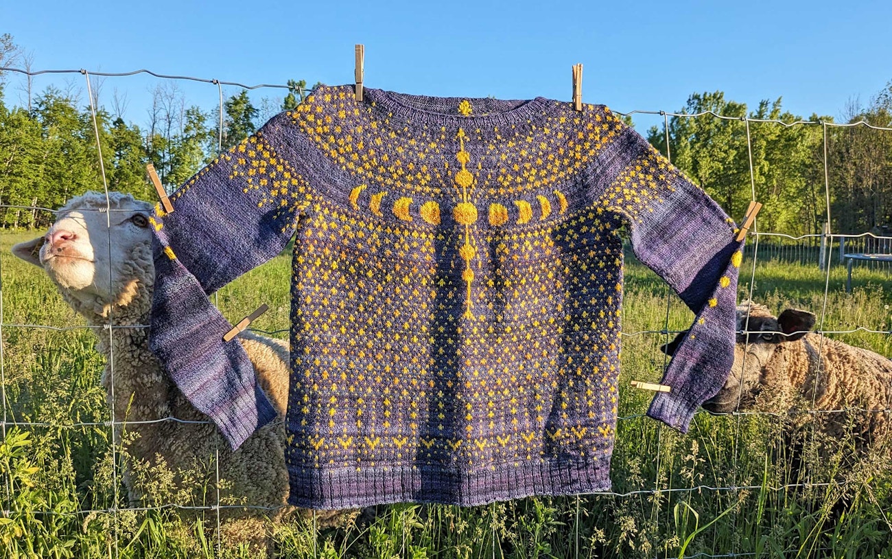 I used Merino top that I dyed with low immersion, spun, and then plied fingering weight yarn on my Electric Eel Wheel 6. I used the Ixchel top-down colorwork yoke sweater pattern by Catherine Clark on Ravelry. My sheep, Laverne and Lorelei, are in the background. Once again, thanks for a great spin-along.