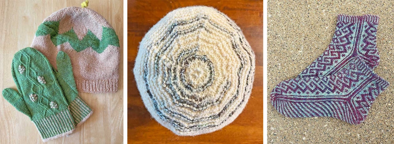 For the colorwork-themed spin-along, I created four projects: the Zigzag Hat (Spin Off Summer 1998) and my own mitten design (inspired by The Sisters of the Winter Wood by Rena Rossner and the poem “Goblin Market” by Christina Rossetti); the Striated Handspun Hat (Spin Off Spring 2023); and the Turkish Stockings (from Socks: A Spin Off Special Publication for Knitters and Spinners).