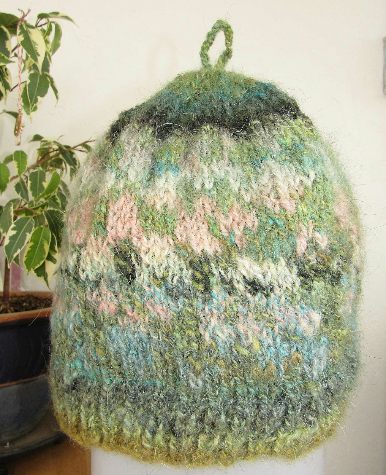 I used two braids of dyed wool for my Monet Hat. I separated each braid into two halves lengthwise. One was more white with some blues and pinks; the other was mostly greens. I spun each half of the braids and then plied them together into a two-ply yarn. I used a couple of patterns from Alice Starmore’s Charts for Color Knitting. The colors ended up being so similar that the design is not clearly visible. Hence why I named it the Monet Hat.