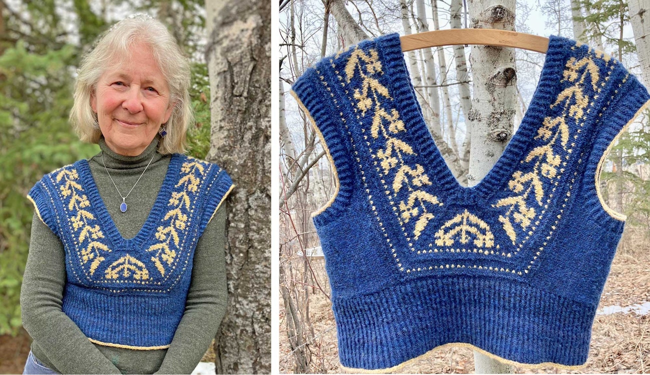 I was excited to learn that this year’s spin-along featured colorwork, as I love spins and knits featuring color in every form. I had some lovely light-brown Ryeland fiber that I wanted to try but it wasn’t enough for the Bifurca Vest by Teti Lutsak that I wanted to make so I combined it with some fine Suffolk-cross wool for a marled two-ply yarn and then dyed it blue. The yellow is 100% Suffolk cross using fiber dyed with dandelion and marigold blended with white and a bit of rose.