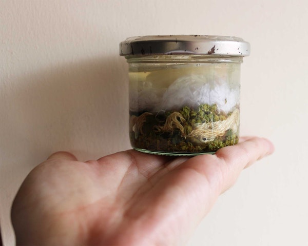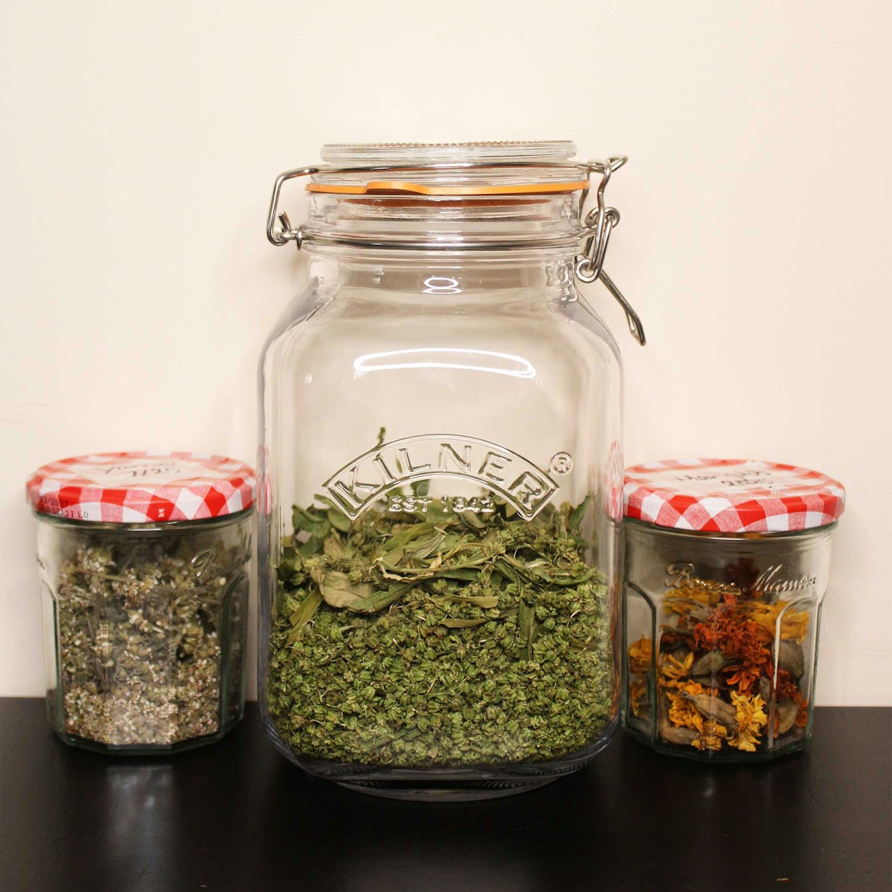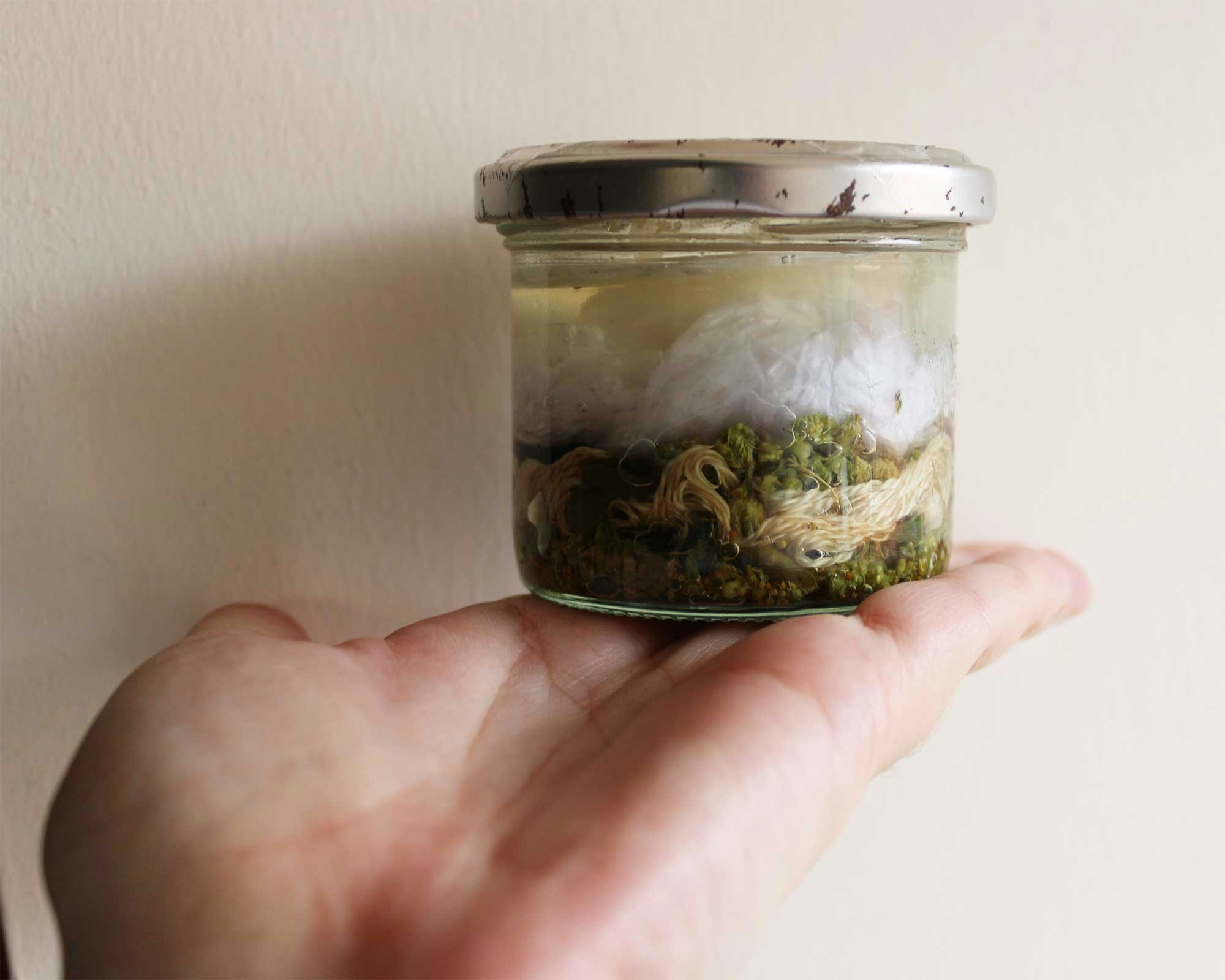 Isabella stores her dried dyestuff in glass jars to extend their shelf life.