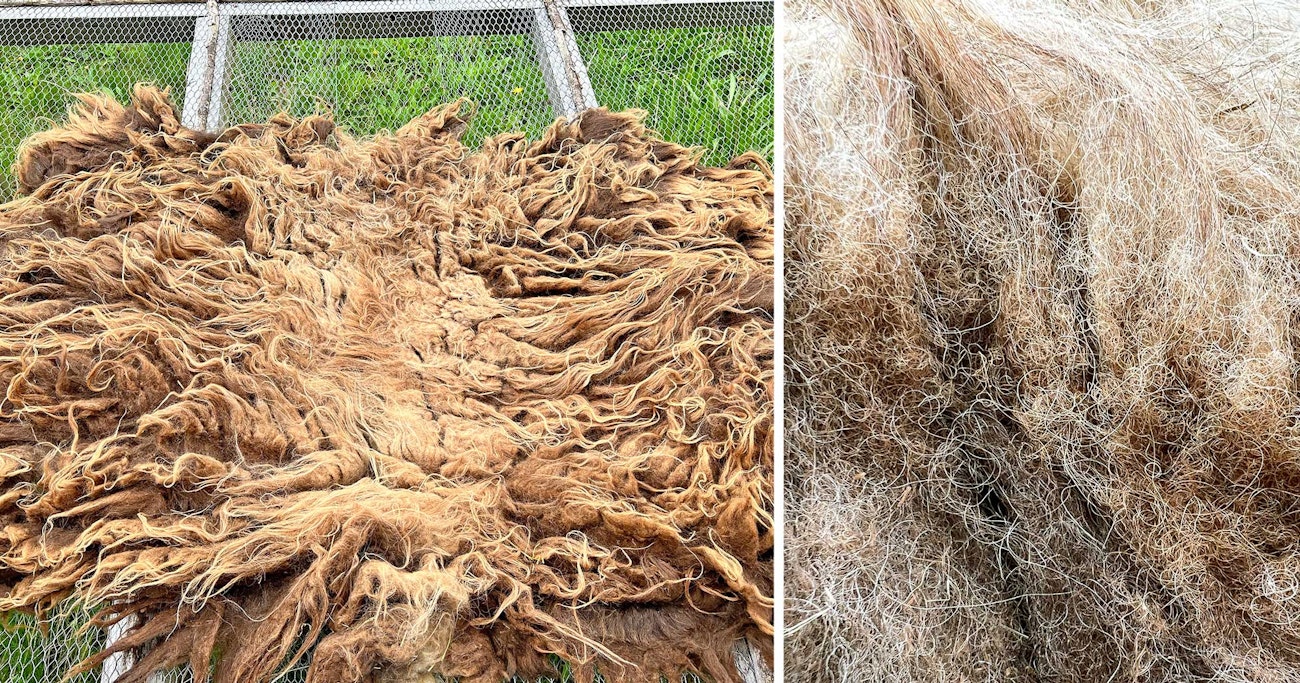 Skudden are often white, but they can be found in a range of natural colors. Here, a brown fleece is freshly shorn and a close look reveals the mix of fiber types in each lock.
