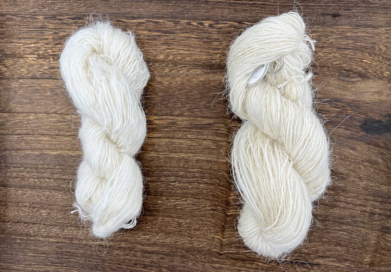 Combed Skudden singles. The softer, whiter skein on the left and the hairy, more beige skein on the right are from different fleeces—there’s a wide range.
