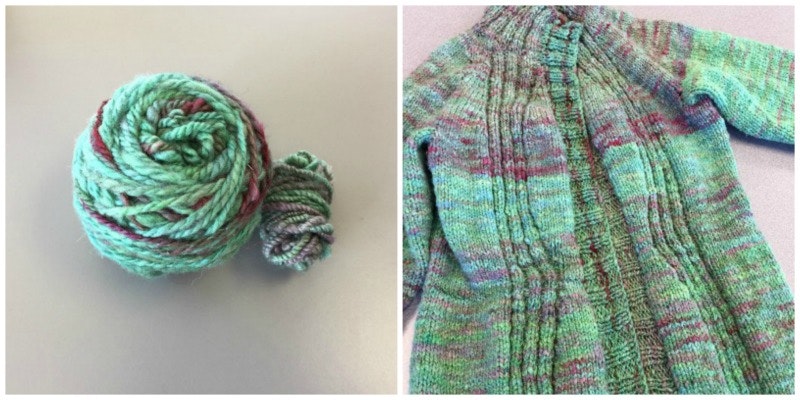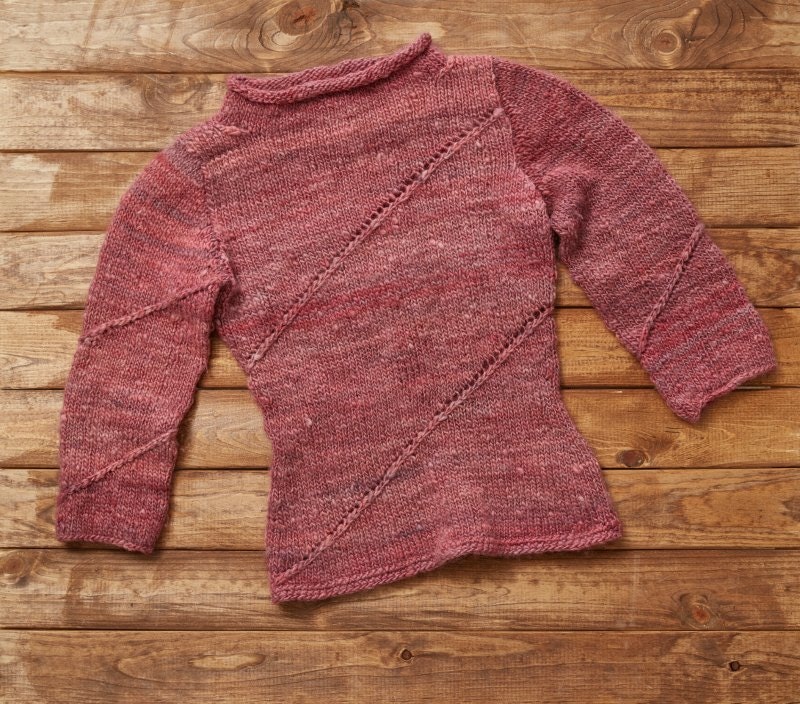 My first major experiment with food-coloring dyes involved liquid food coloring, a pound of raw Coopworth fleece, and my beloved drumcarder. After I scoured the fleece, I tied it into softball-sized “mozzarella balls” (a tip from Gail Callahan’s book) and dyed it with purple food coloring. The fleece came out in mixed shades of berry—inner sections of the cheeseballs picked up less of the dye than the outer layers. I then drumcarded the colored fleece into tonal batts and spun a bulky singles yarn. Kira Dulaney’s Traveling Eyelet Sweater suited this gorgeous handspun perfectly.