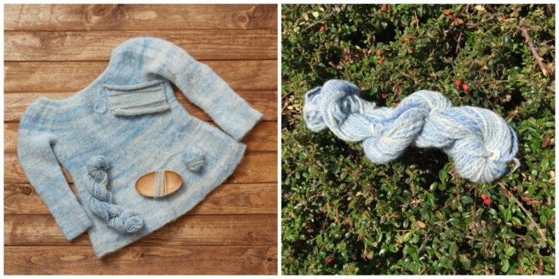 Spoiler alert—this sweater project ended in disaster, but not because of the sweater pattern or the dyeing. Here I used several breeds: a Corriedale/Romney sheep named Annie plus a Finnsheep. About three-quarters of the raw wool stayed in its natural color. I dyed the remainder in cheeseballs with blue food coloring. Then I drumcarded pure white batts and pure blue batts, which I then blended into variegated batts. These variegated batts became a wonderful 2-ply worsted/DK yarn, which then became Kathleen Dames’s glorious Sotherton sweater from Jane Austen Knits, Summer 2012. Unfortunately, I didn’t love the finished sweater because it was too big and heavy, without the body-hugging fit that Kathleen had intended. I tried felting it slightly in the washing machine to reduce the size. That’s when disaster struck in the form of a completely felted sweater. Ooopsssss. The now-felted body may become a basket or a tote bag, and the sleeves can become holders for straight needles and DPNs.