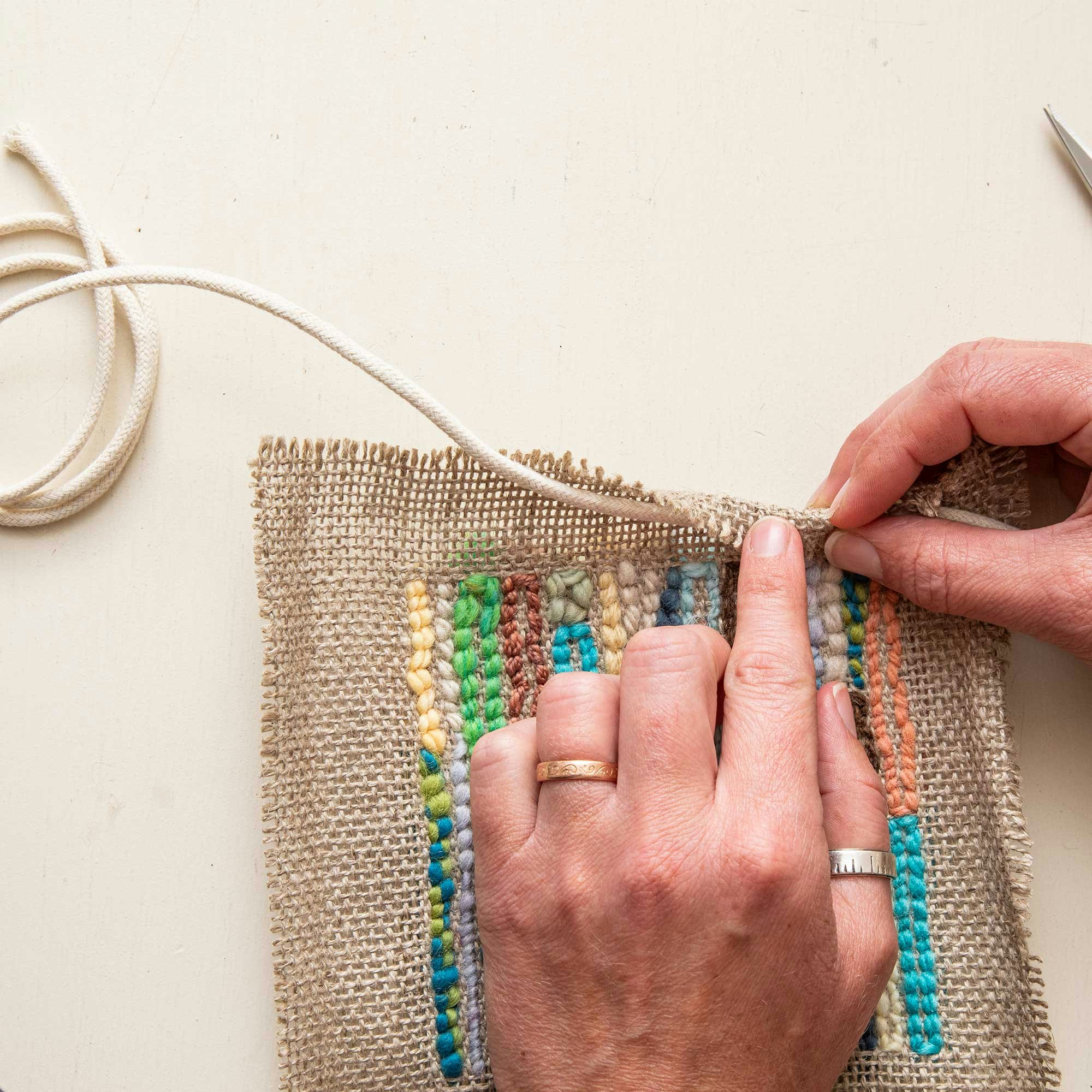 To create a whipped border, I wrap the trimmed backing cloth around a cord, then whipstitch it with yarn threaded through a tapestry needle. The goal is to completely cover the backing cloth, so I often hold the yarn double. You will not be sewing through any of your hooked design—you are only stitching through the backing cloth.