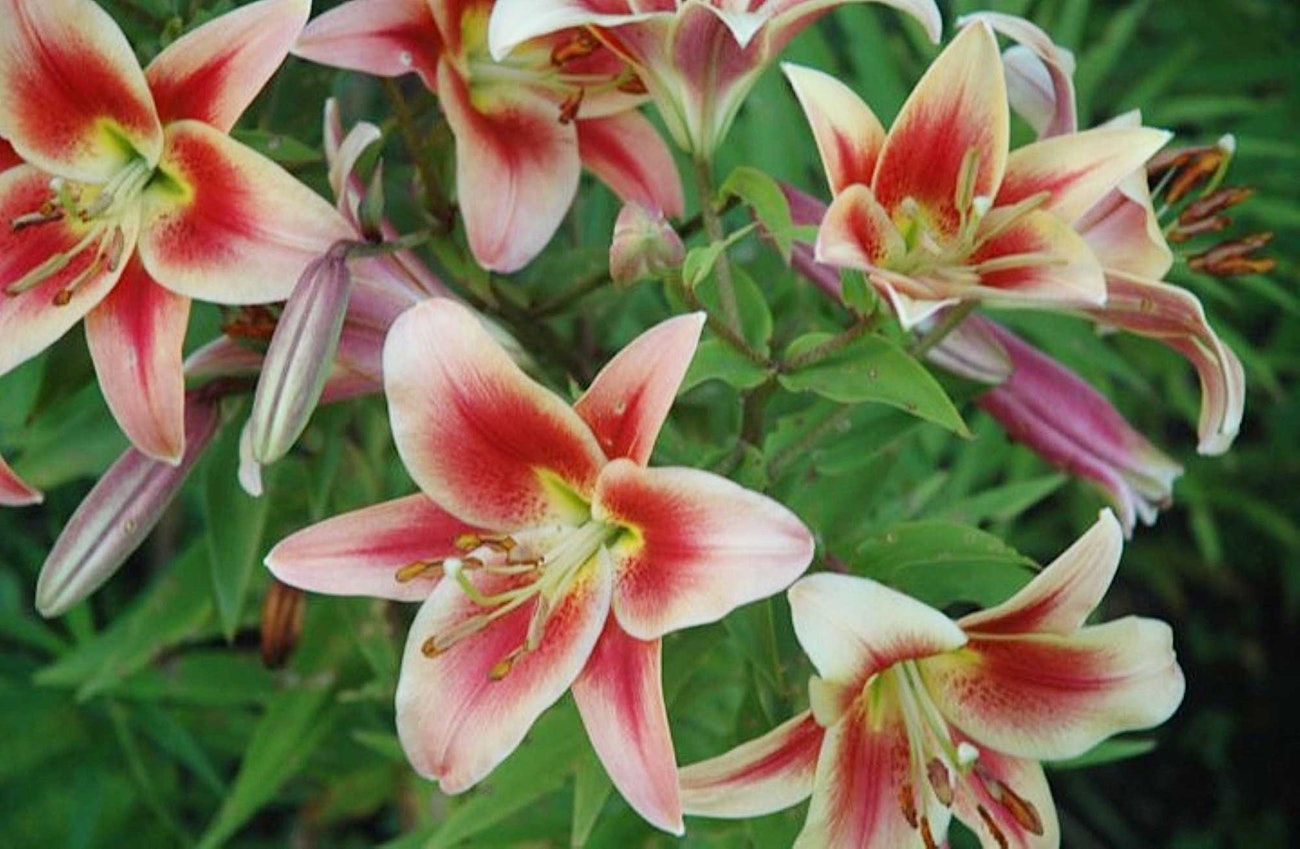 These lilies have petals that display a gradient starting at bright green in the center, through hot pink, to pale pink at the outer edges.