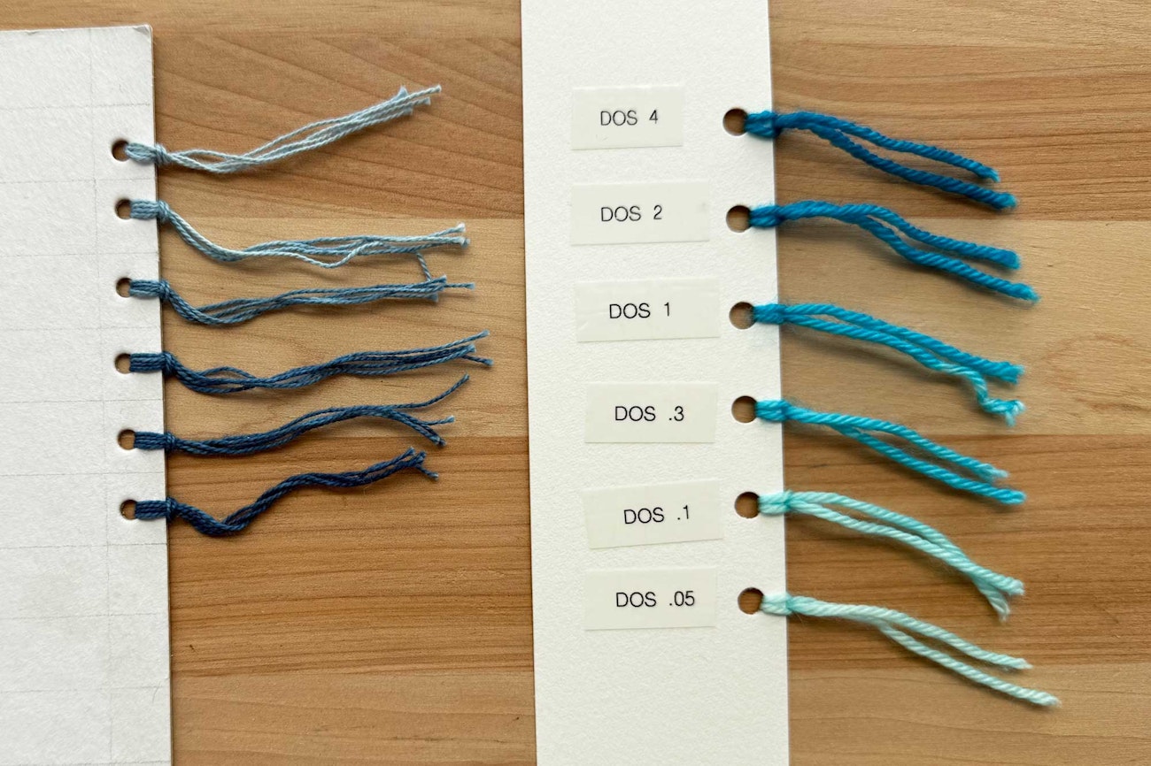 The set of samples on the left shows indigo dye in progressively darker shades, produced from repeated dips in an indigo vat. The samples on the right show an effect from several different dyebaths, starting with the most concentrated dyebath and going to the most diluted dyebath. This effect is known as “Depth of Shade,” commonly called DOS by dyers. Photo by Pamela K. Schultz