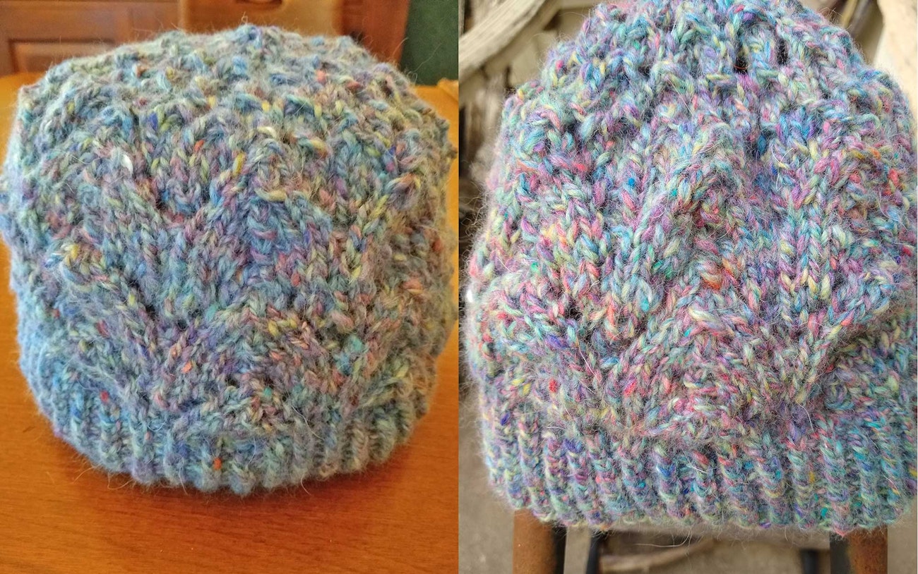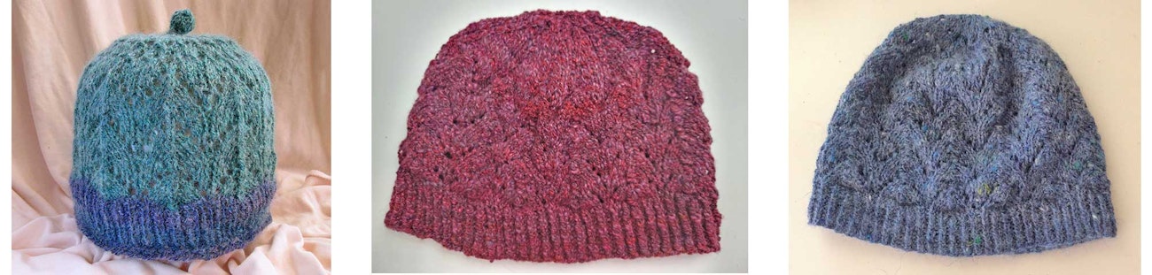 Here are photos of my very favorite, go-to, handspun cap (from left to right).