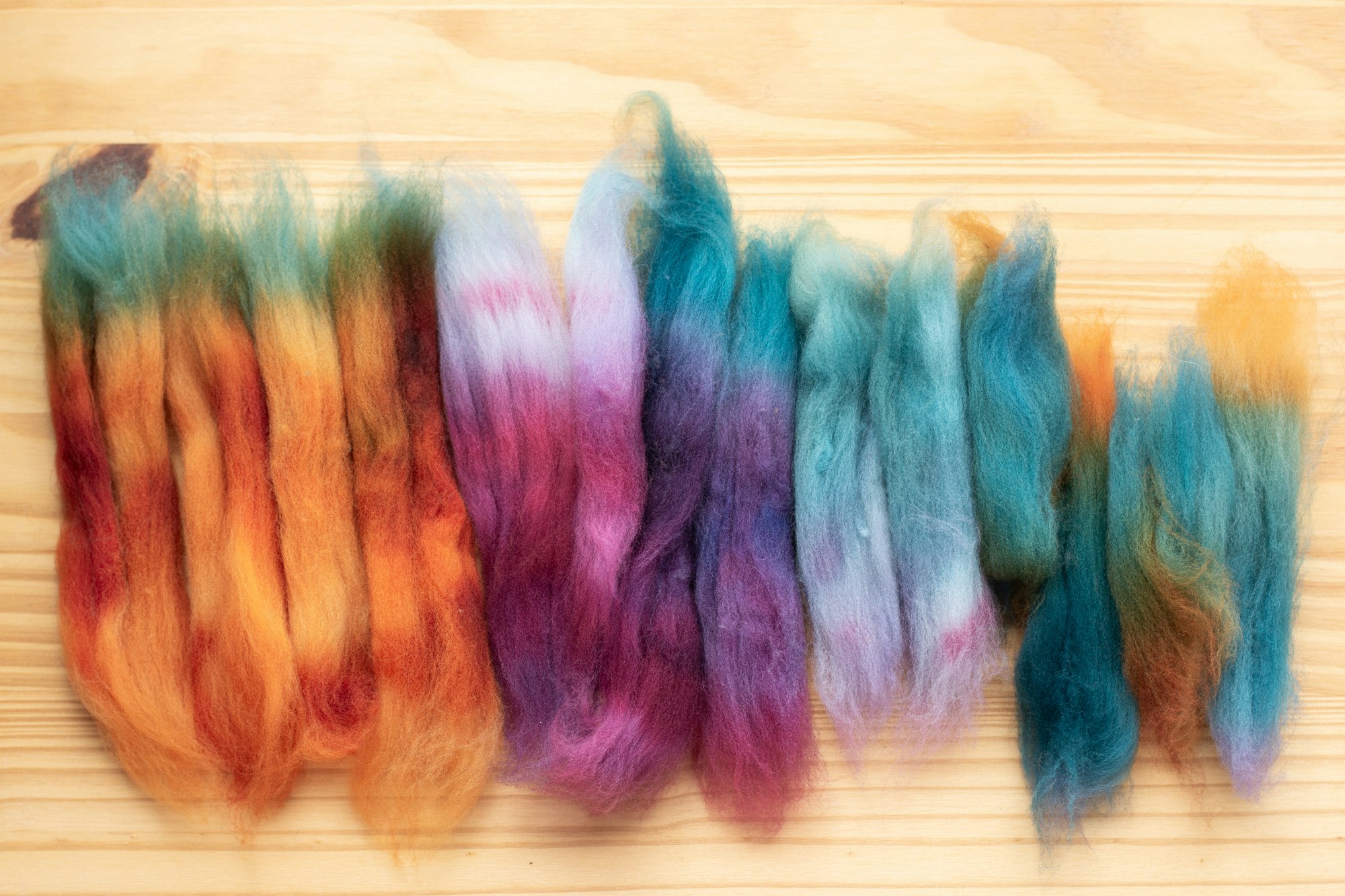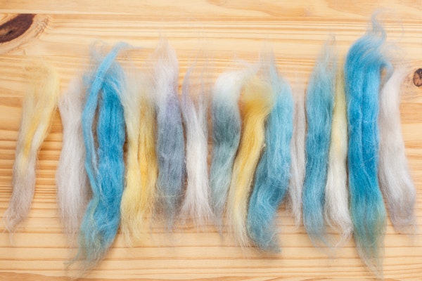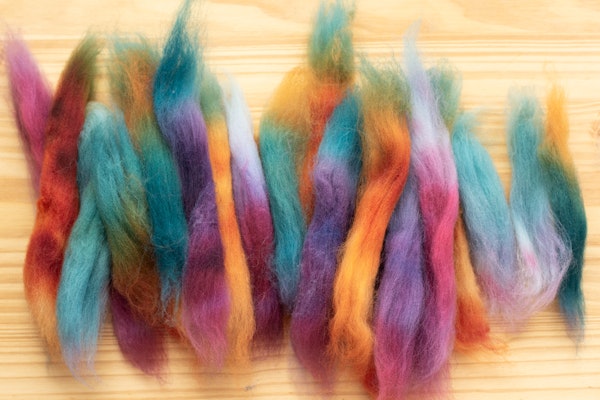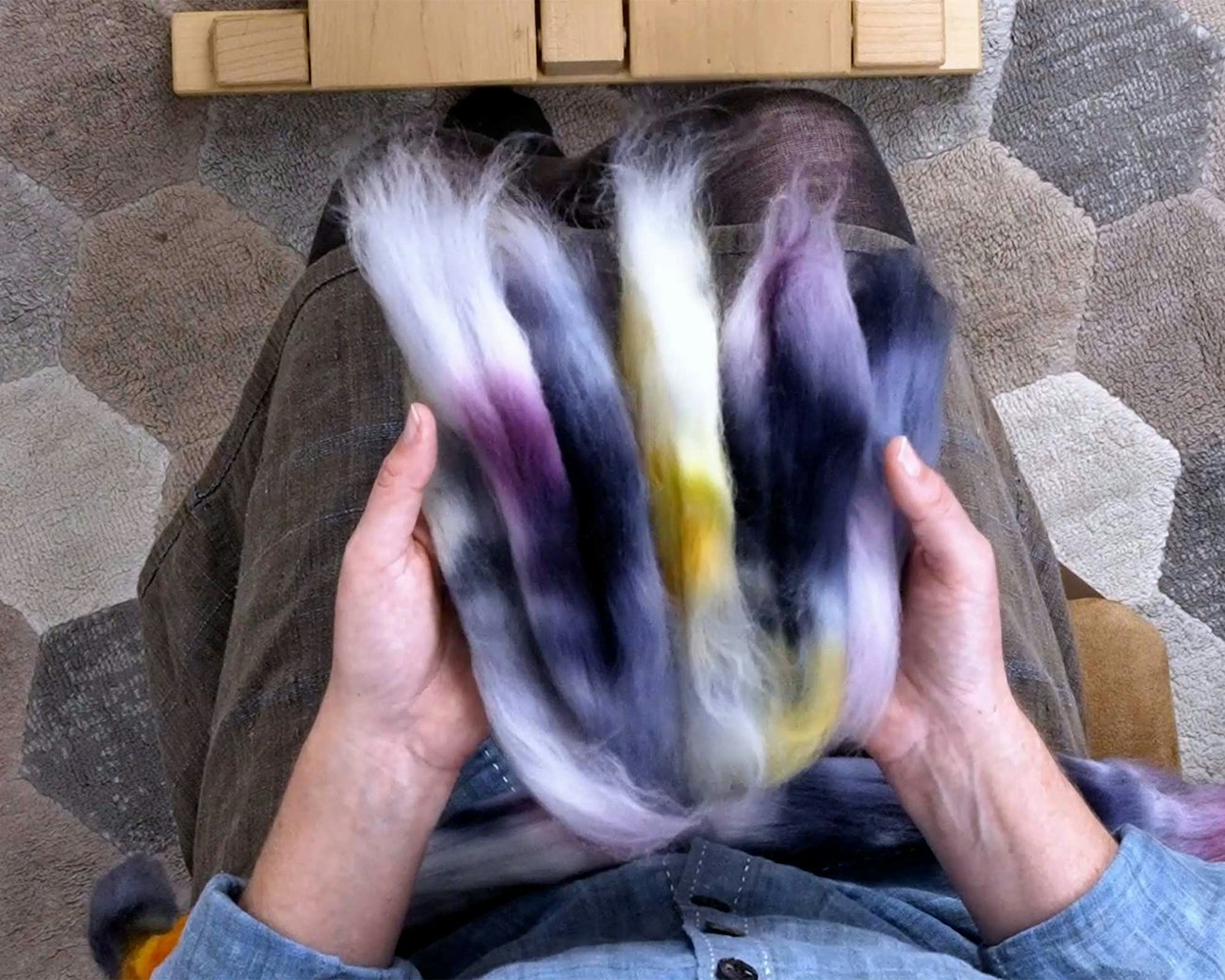 To shuffle your colors, simply break apart your fiber into smaller sections, then shuffle the colors in your hand like a deck of cards.