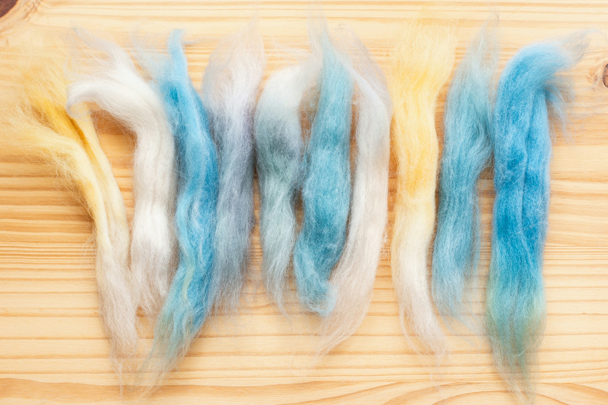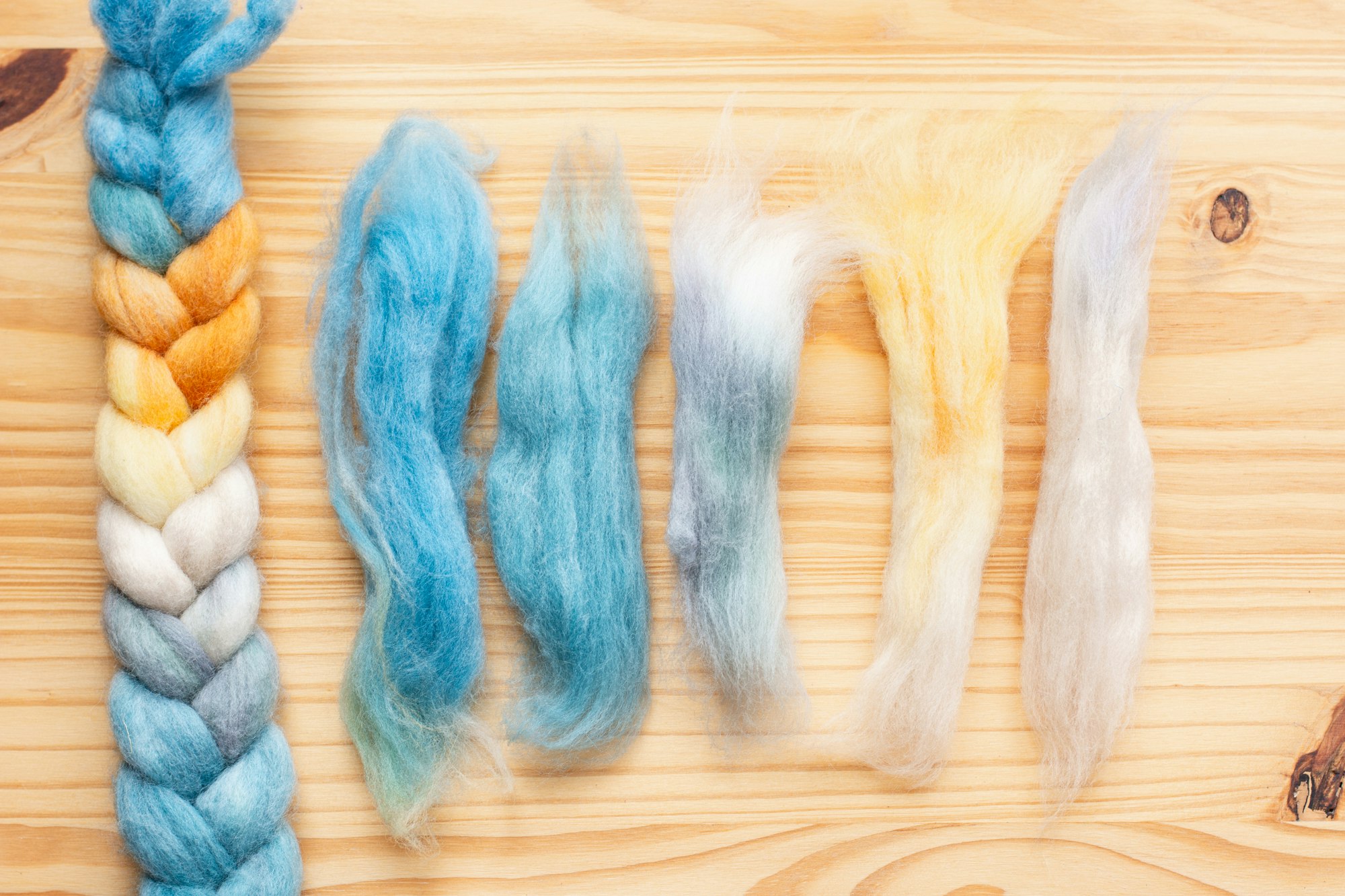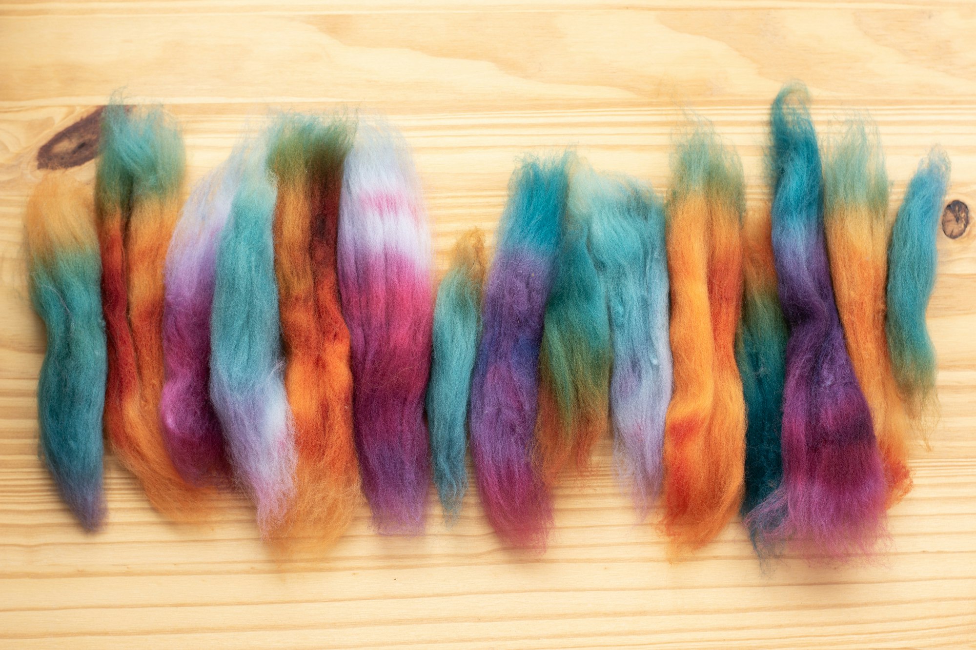 To shuffle your colors, simply break apart your fiber into smaller sections, then shuffle the colors in your hand like a deck of cards.