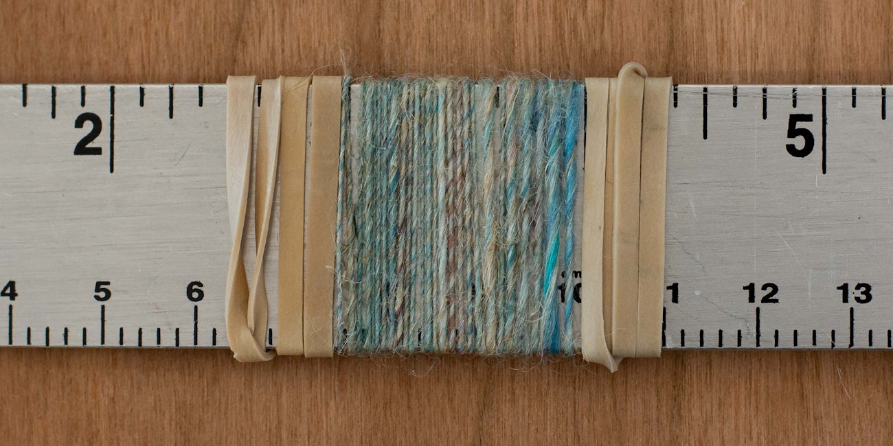 To make things easier, wind two rubber bands on the outside of your one-inch sections. Not only will this create bumpers to keep your yarns from sliding around uncontrollably, but it also allows you to tuck your ends under the rubber bands. This prevents your yarn from losing twist—and you from losing patience—as you take your wpi measurement.