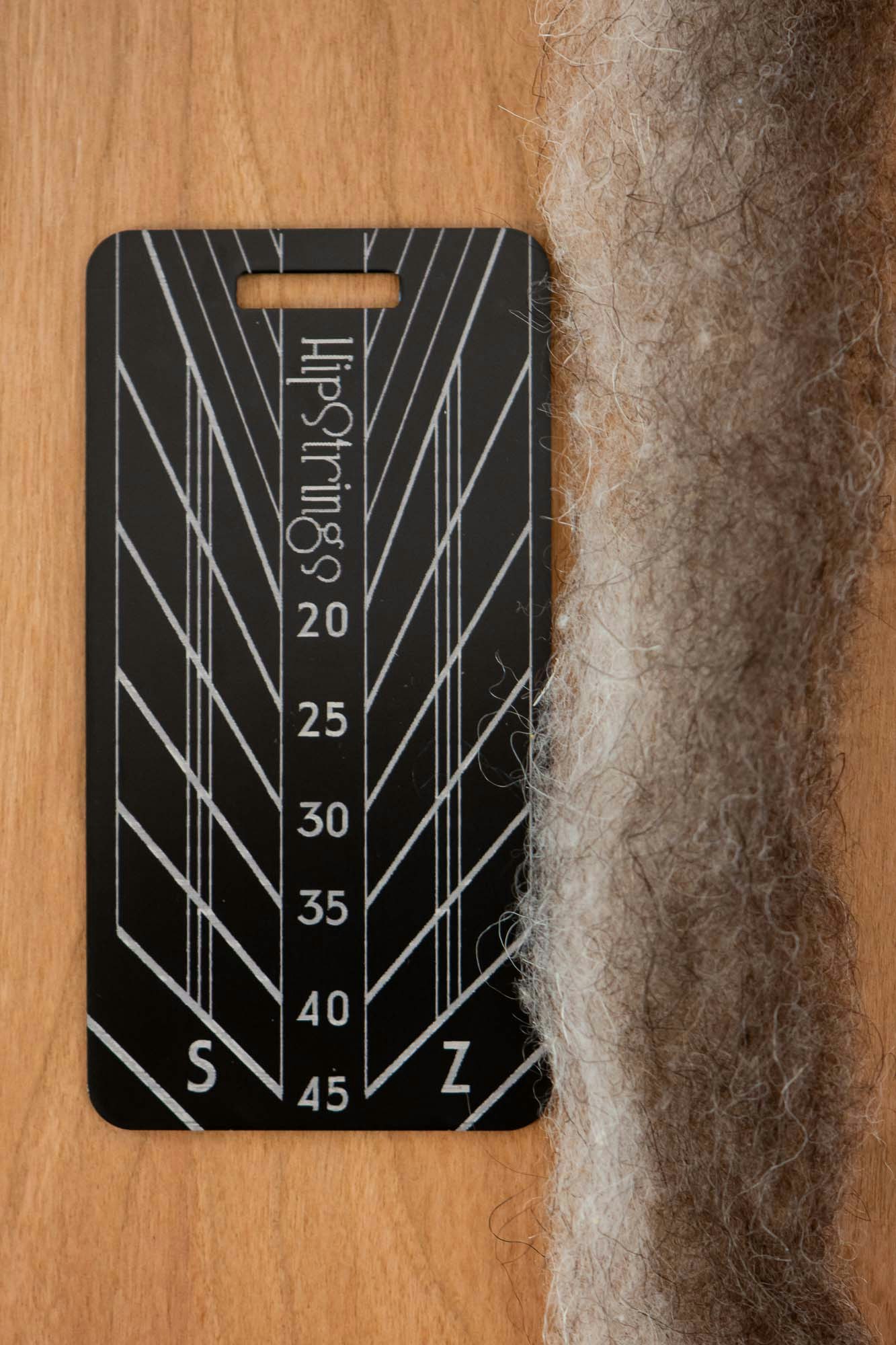 Most singles are spun to between 20–35°, although there are useful applications for yarns with more twist (such as crepe yarn) and less twist (like Lopi sweaters). For this reason, some twist angle tools for spinners only include these more common measurements, with more increments in the range spinners are likely to use. With these tools, you’ll lay the fiber parallel to the vertical guides to check the twist angle.