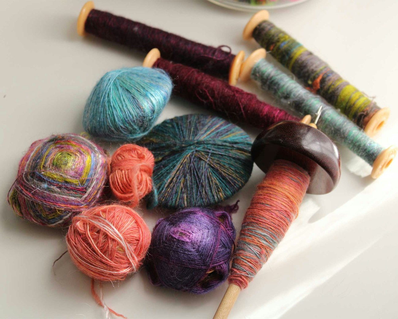 Just a few of Debbie’s leftover singles, ready for plying practice. Note the variety of options in how the singles are stored for plying. Photo by Debbie Held