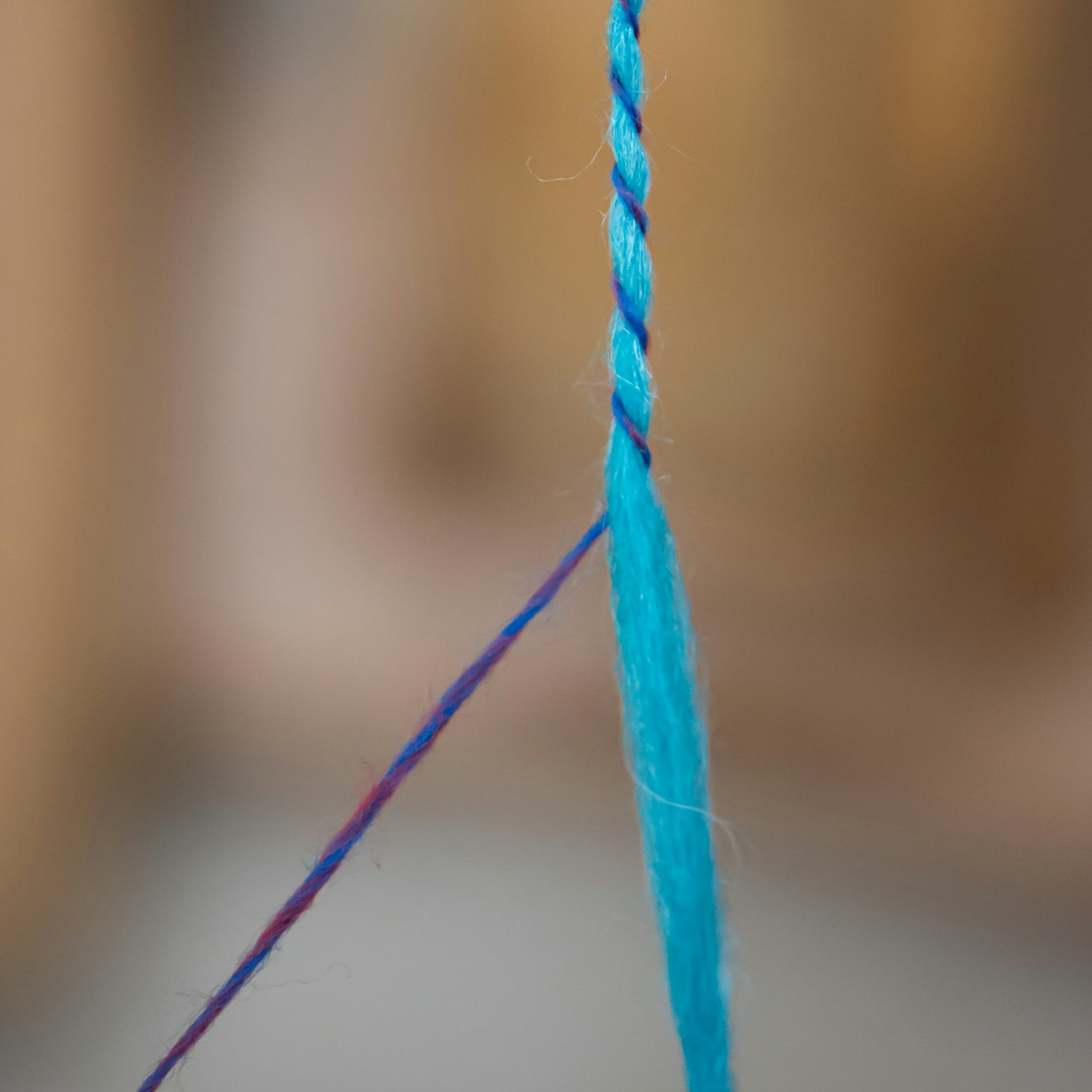 Here’s How: Once your plies are connected to your leader, hold the finer strand in your front hand (the one that's closer to the wheel) at roughly 45 degrees to the wheel. Hold the fatter singles in your back hand as usual. Slowly begin to ply, creating a spiral as you do.
