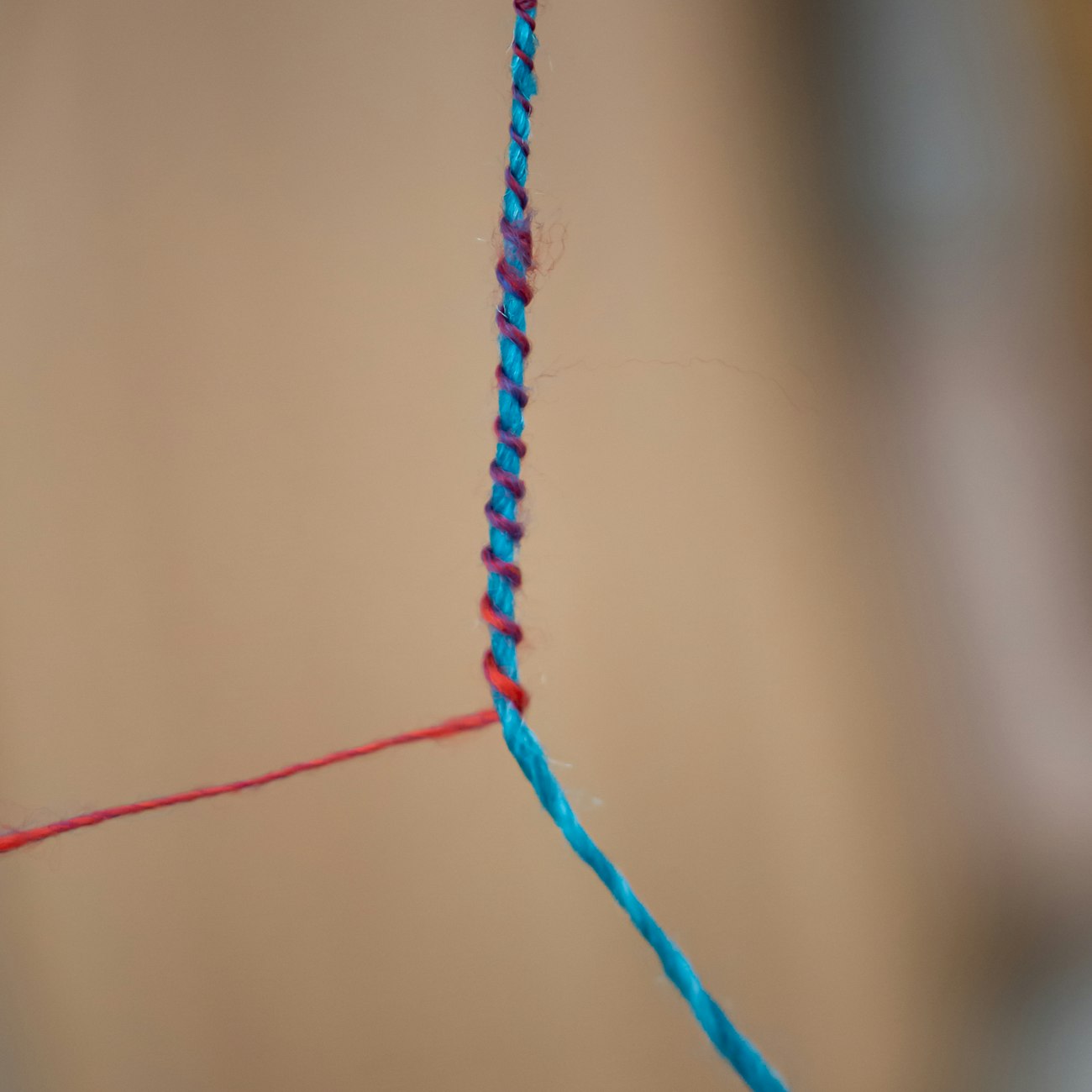 A variation on the 90-degree spiral ply, where the thicker yarn is spiraling around the thinner one. Photo by Pamela K. Schultz