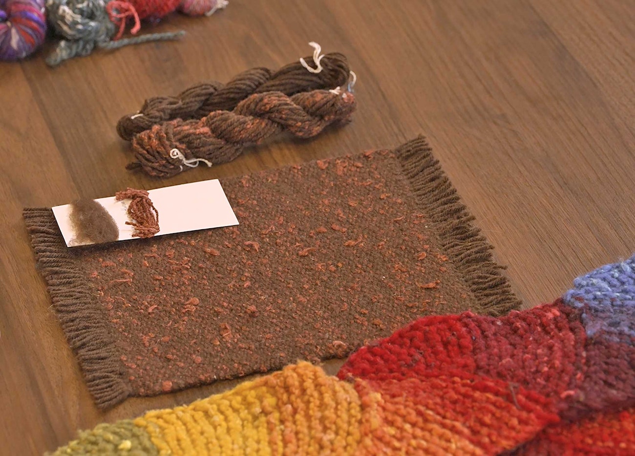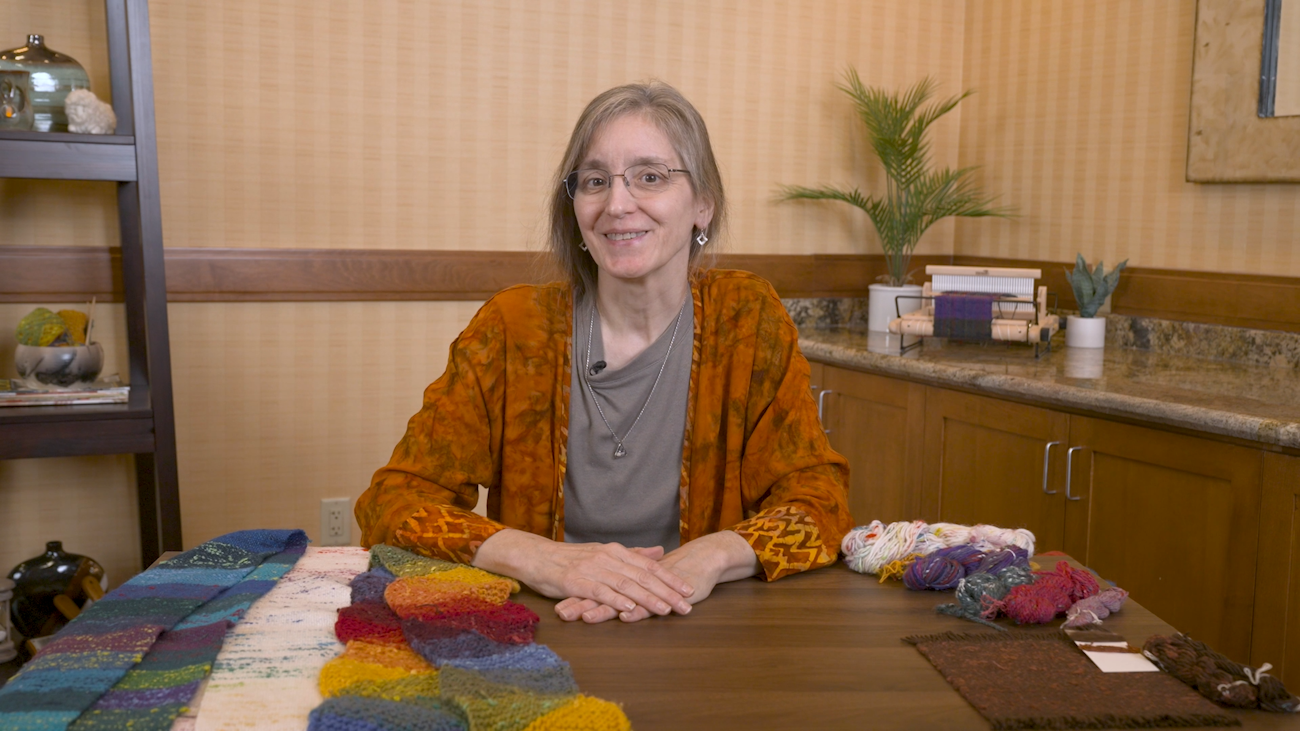 Angela discusses weaving with different blends and shows a scarf that also serves as a color and texture study.