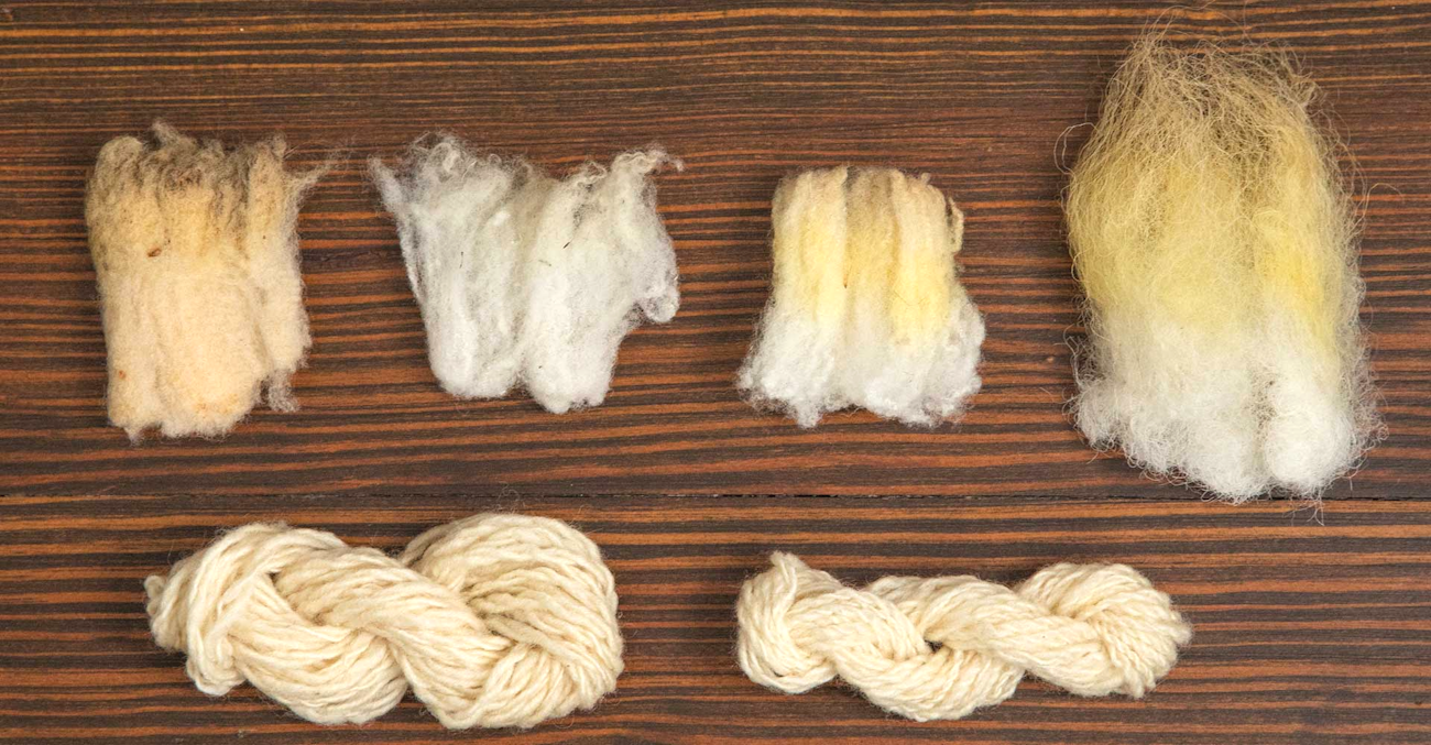 Top from left: A raw lock and washed locks from different parts of the fleeces. Bottom from left: Bulky-weight yarn from Laureen’s first samples and worsted-weight yarn from the second samples. Photo by Matt Graves