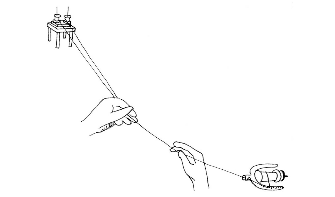 In his Big Book of Handspinning, Alden Amos recommended placing the bobbins 8 feet from the orifice to ply. Illustration by Stephenie Gaustad