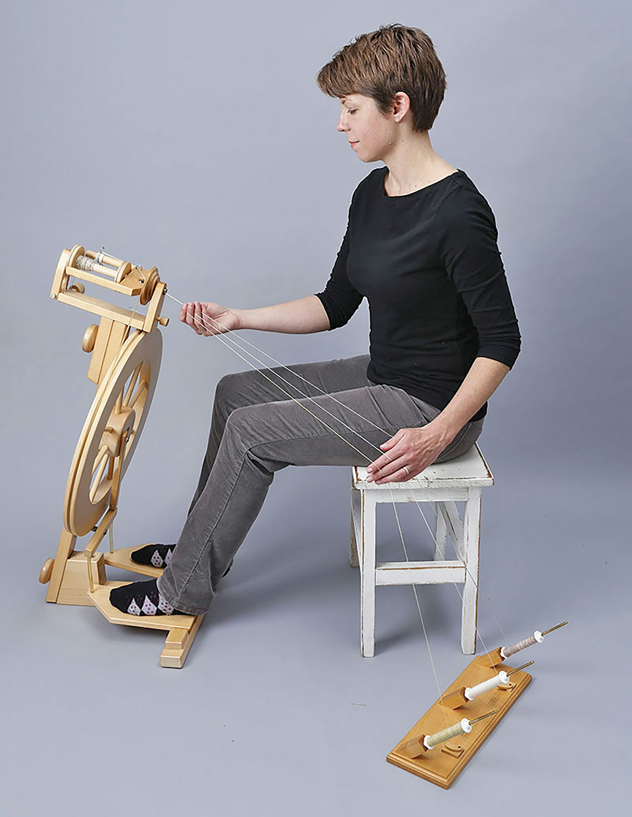Clever Kate Larson plies with the lazy kate an arm’s length away, beside and slightly behind her. Photo by Donald Scott