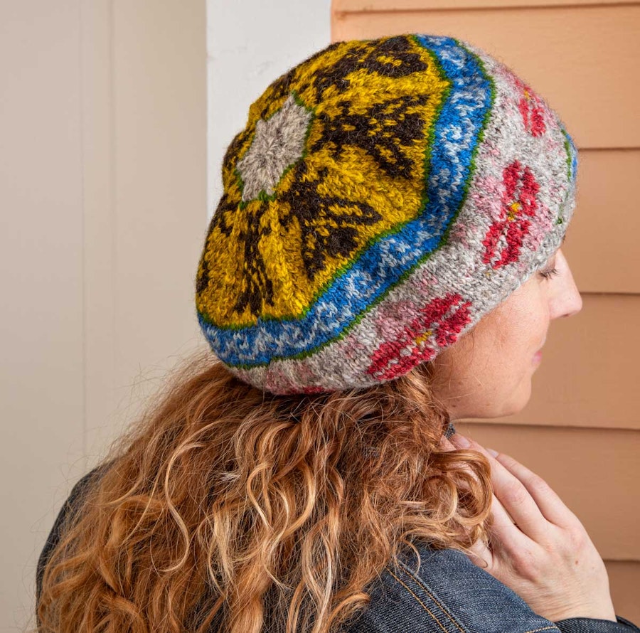 Yarn 2-ply DK weight (900 ypp; 12 wpi), 340 yd total. Gray marl (MC) and yellow (CC7), 1 oz (28.5 g), 65 yd each; green (CC1), light blue (CC2), dark blue (CC3), light pink (CC4), dark pink (CC5), and black (CC6), ½ oz (14 g), 35 yd each.
